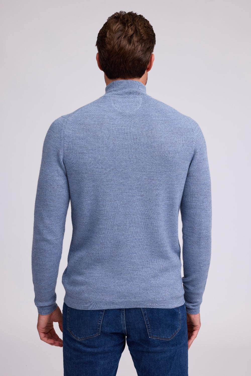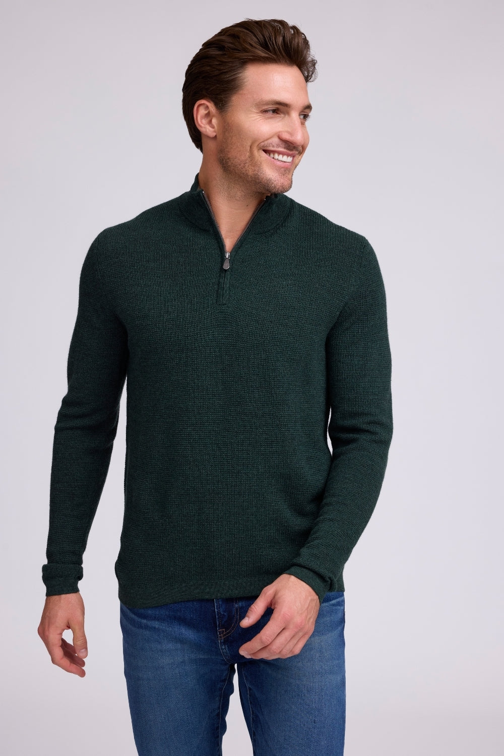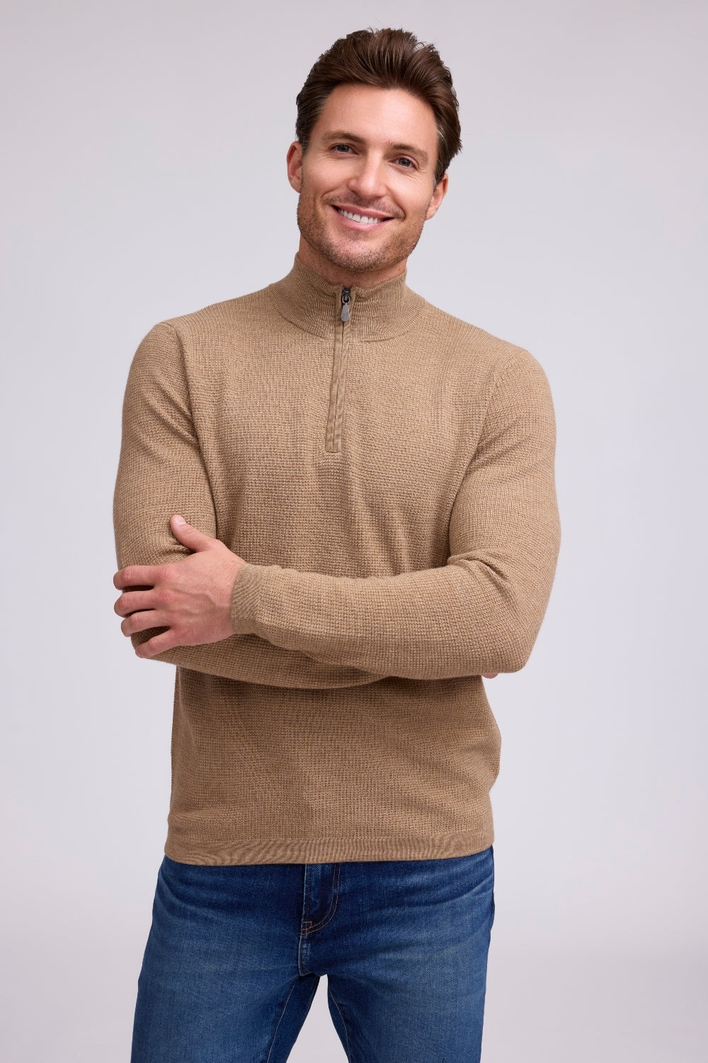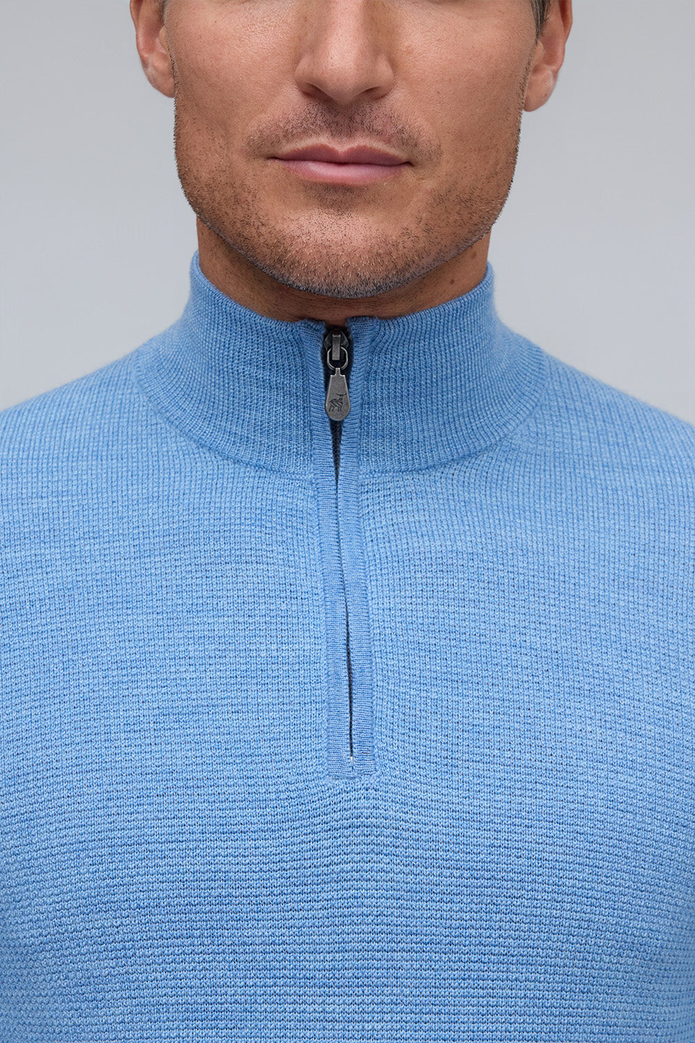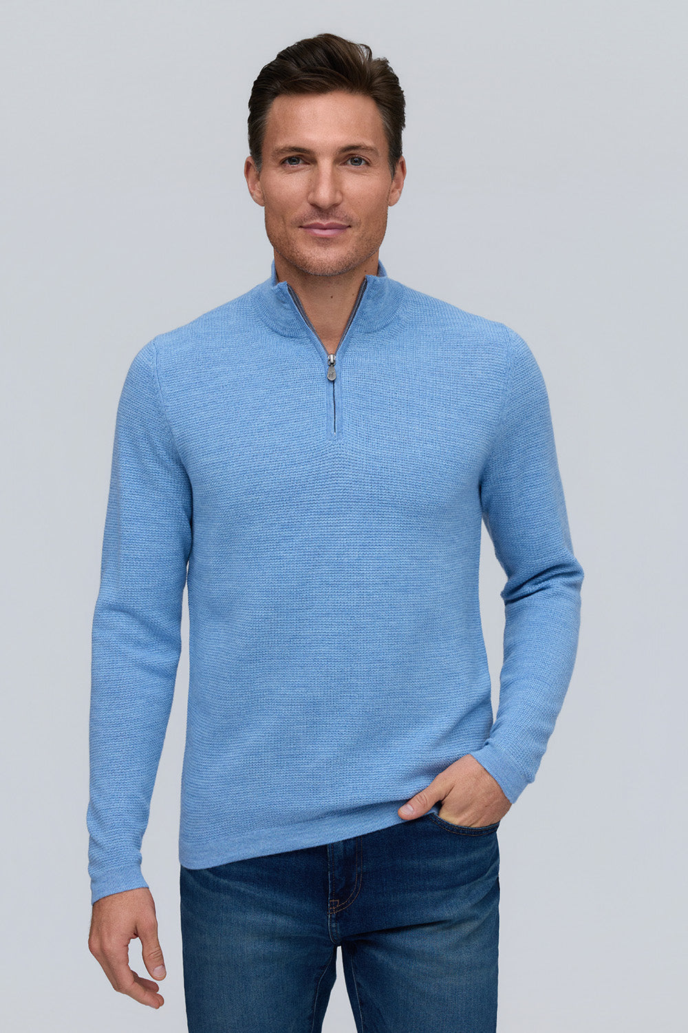 Our 100% Extrafine Merino Wool mock sweater is a perfect addition to your wardrobe. Waffle knit stitched for interesting texture in a medium weight, The Ian has full fashion detailing, with complementary color trim on the cuff, hem, and inside high-stand collar. Worn alone or layered over a tee or button-down, this classic sweater works at the office or out with friends.