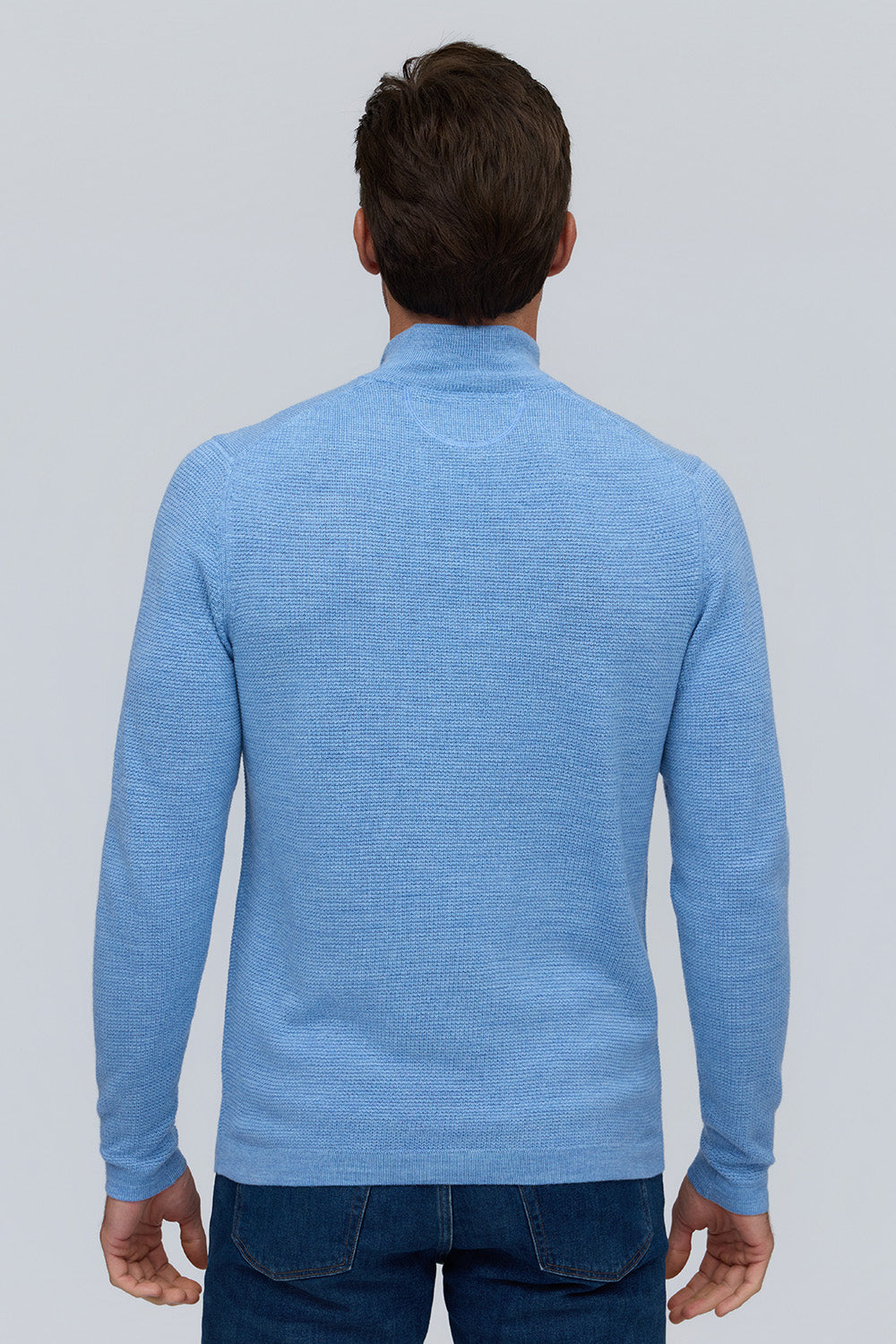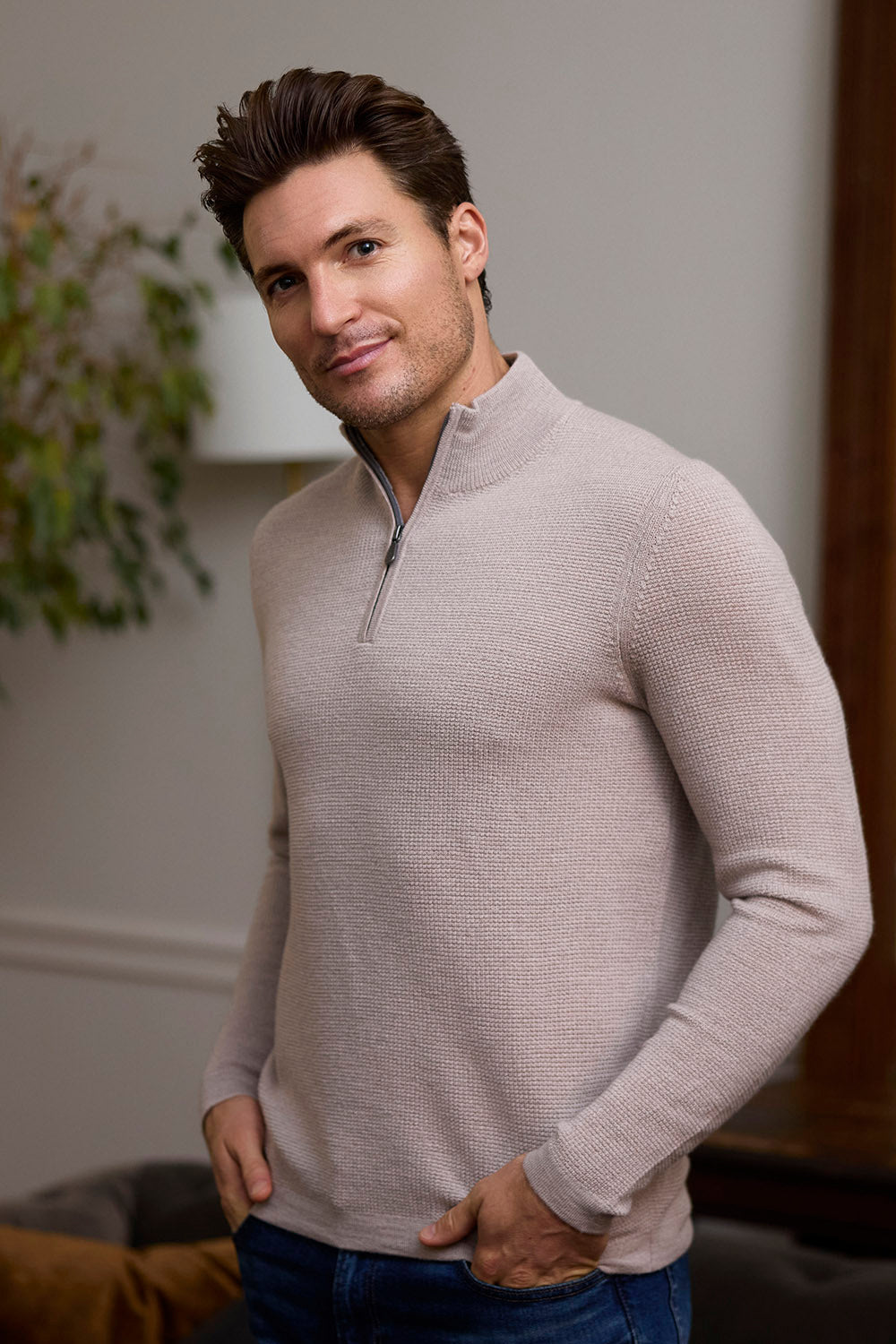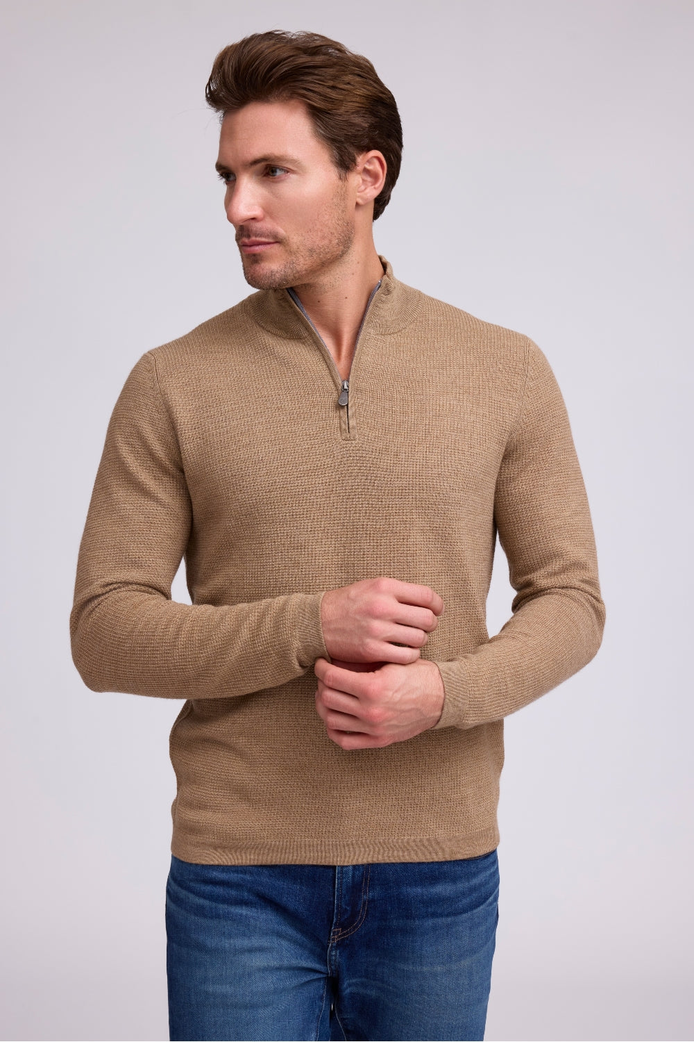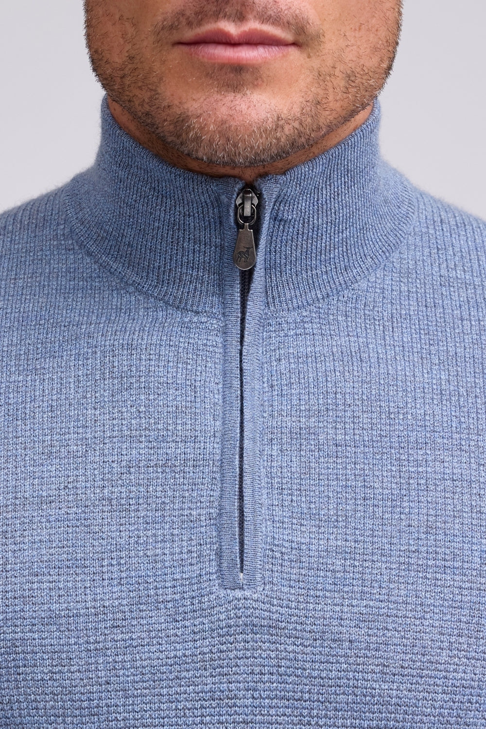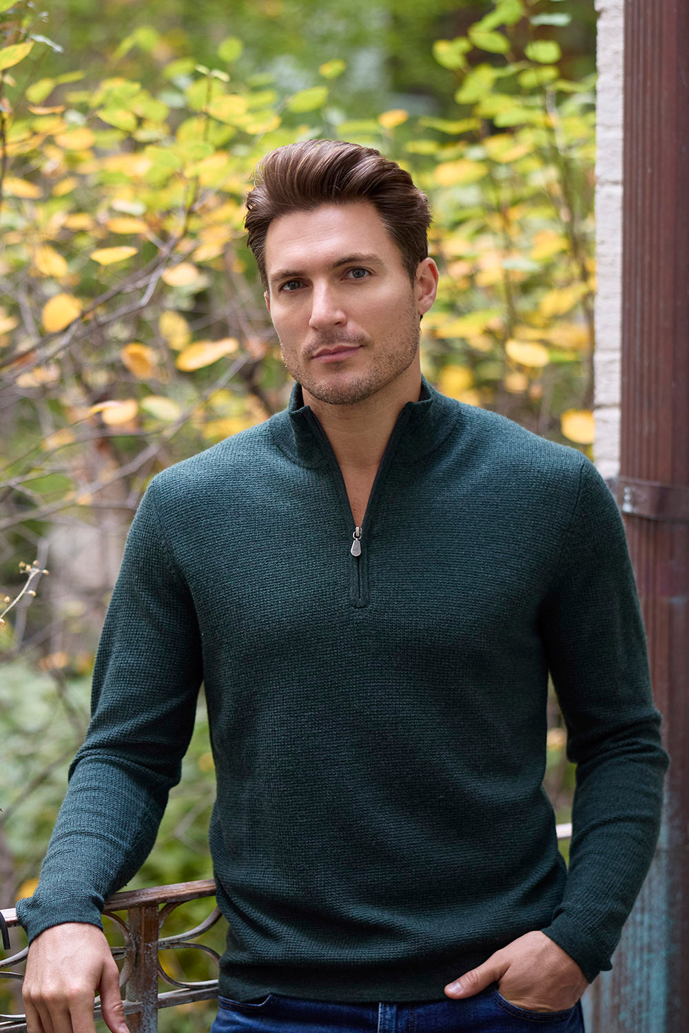 Our 100% Extrafine Merino Wool mock sweater is a perfect addition to your wardrobe. Waffle knit stitched for interesting texture in a medium weight, The Ian has full fashion detailing, with complementary color trim on the cuff, hem, and inside high-stand collar. Worn alone or layered over a tee or button-down, this classic sweater works at the office or out with friends.