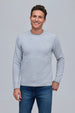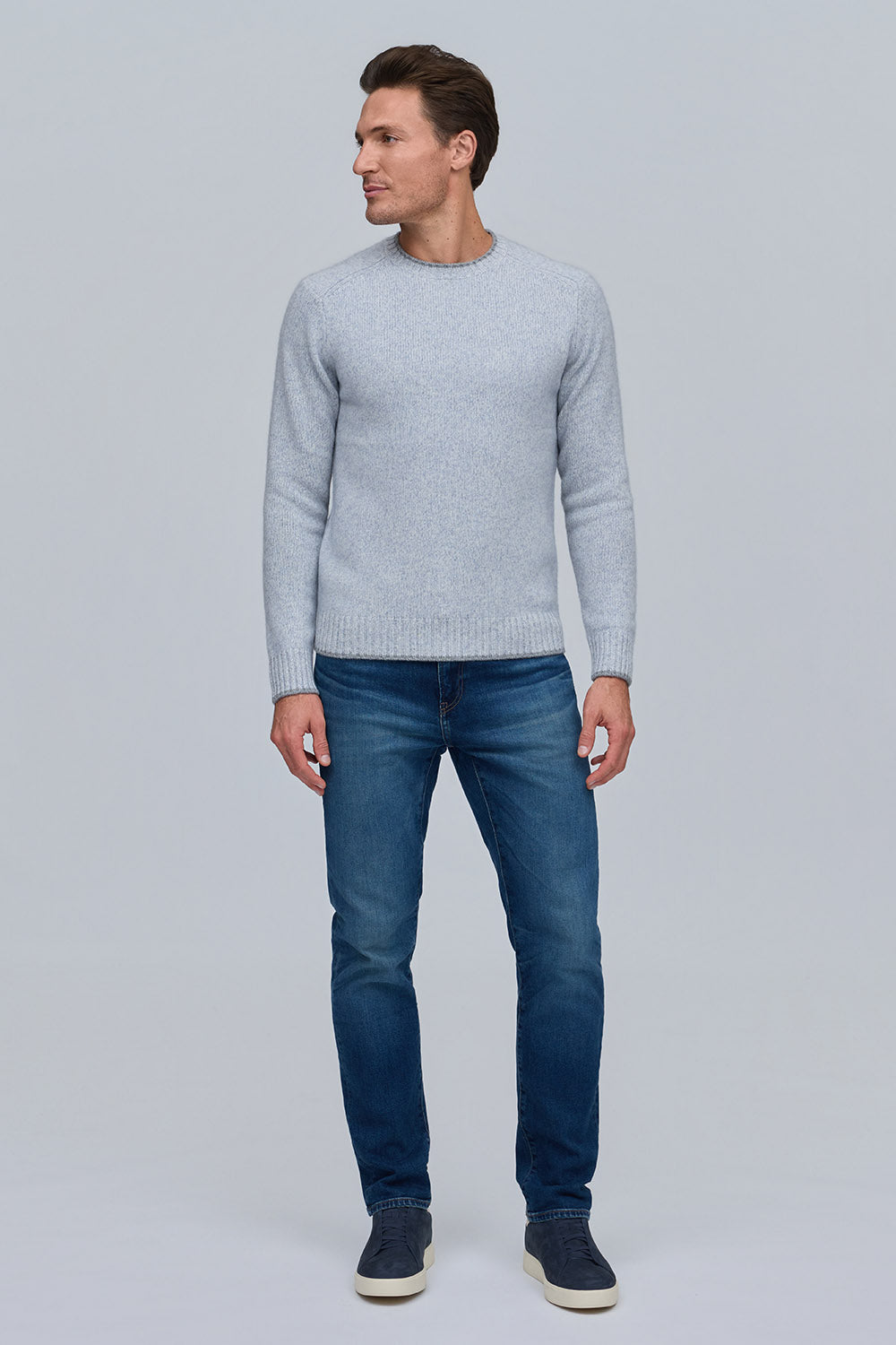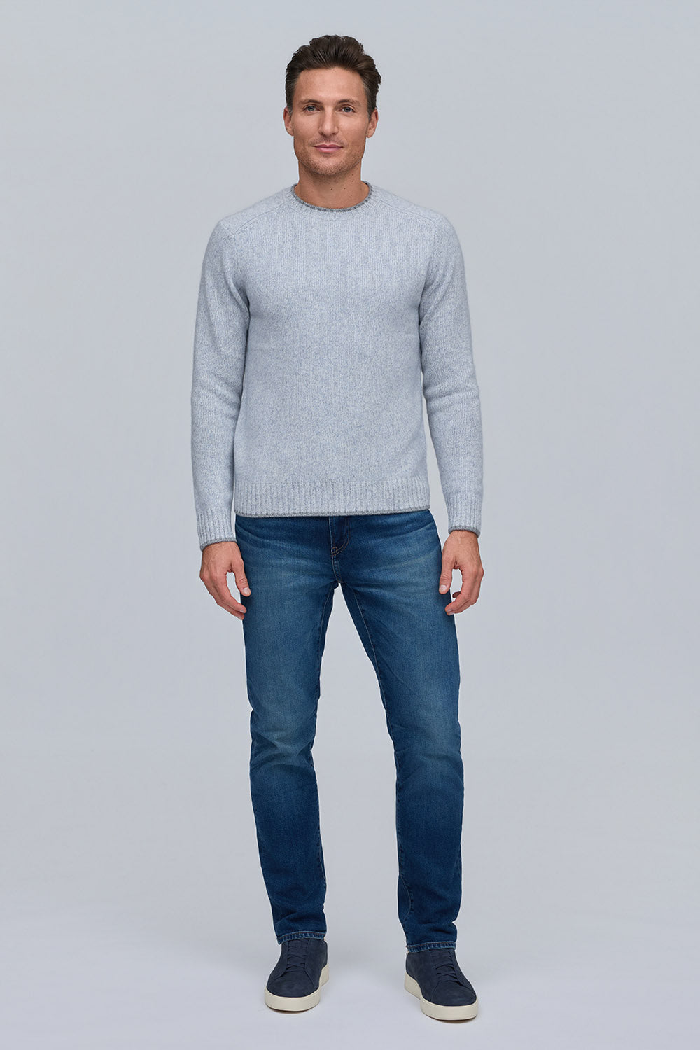 Our cashmere mouline tweed crew neck sweater blends warmth with elevated style. Crafted from 70% wool and 30% cashmere in a soft cloud hue, it’s detailed with refined grey trim—an elegant layer for cold-weather sophistication.