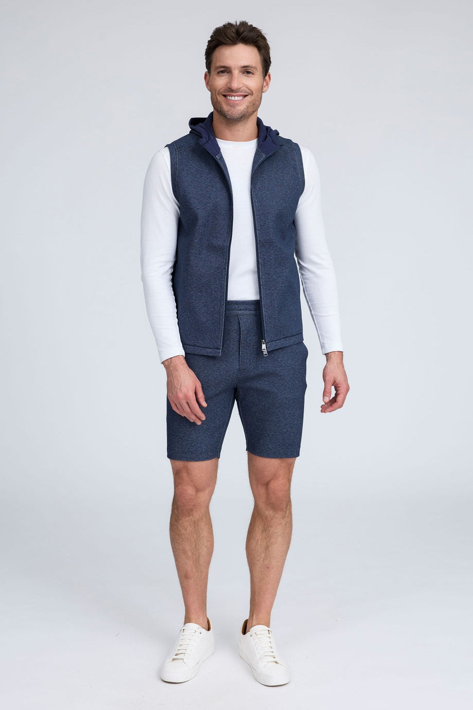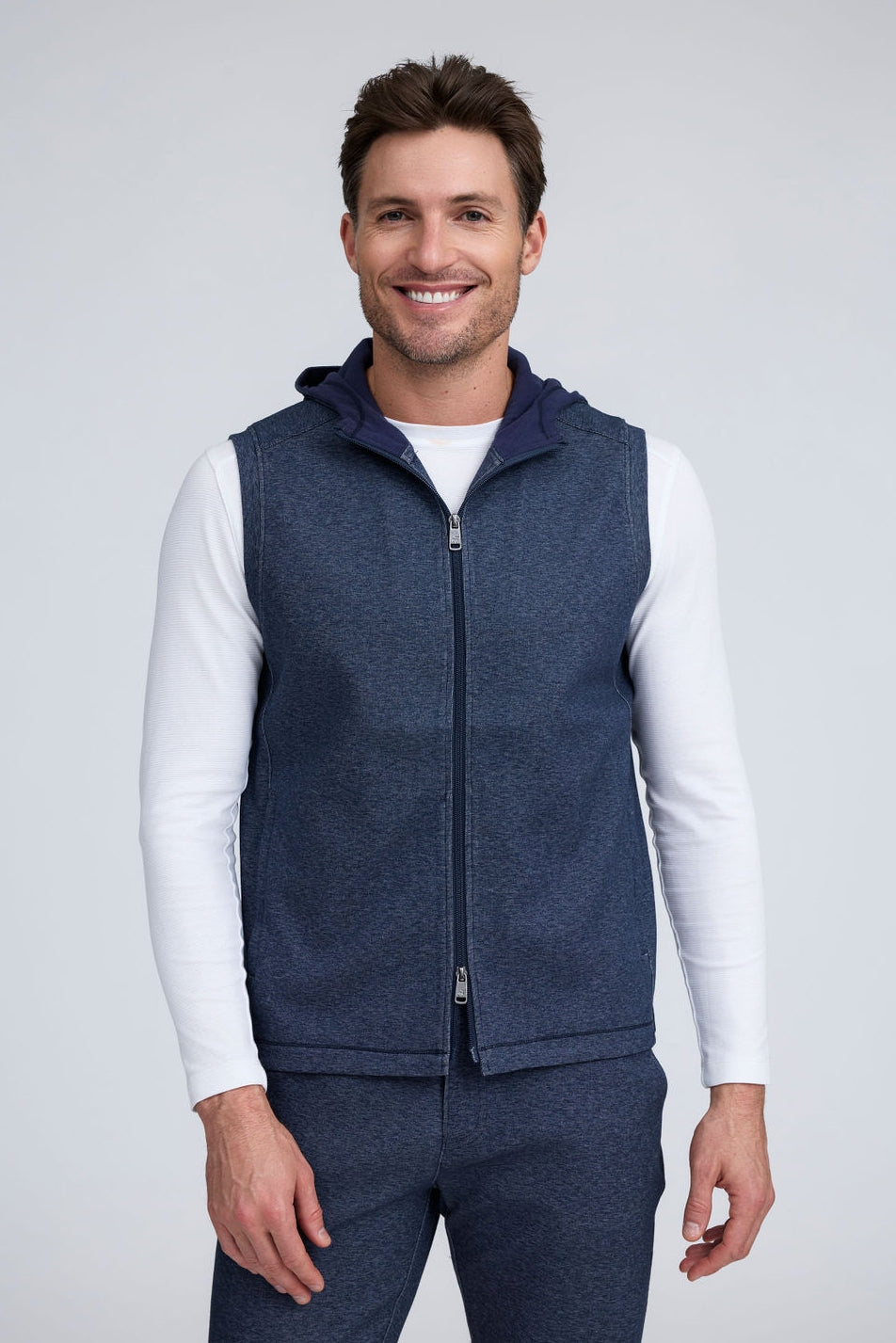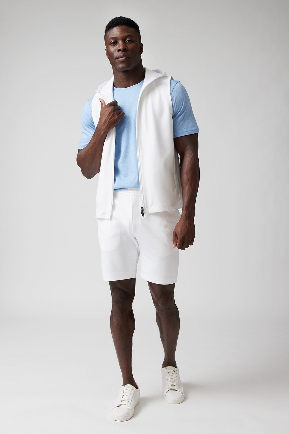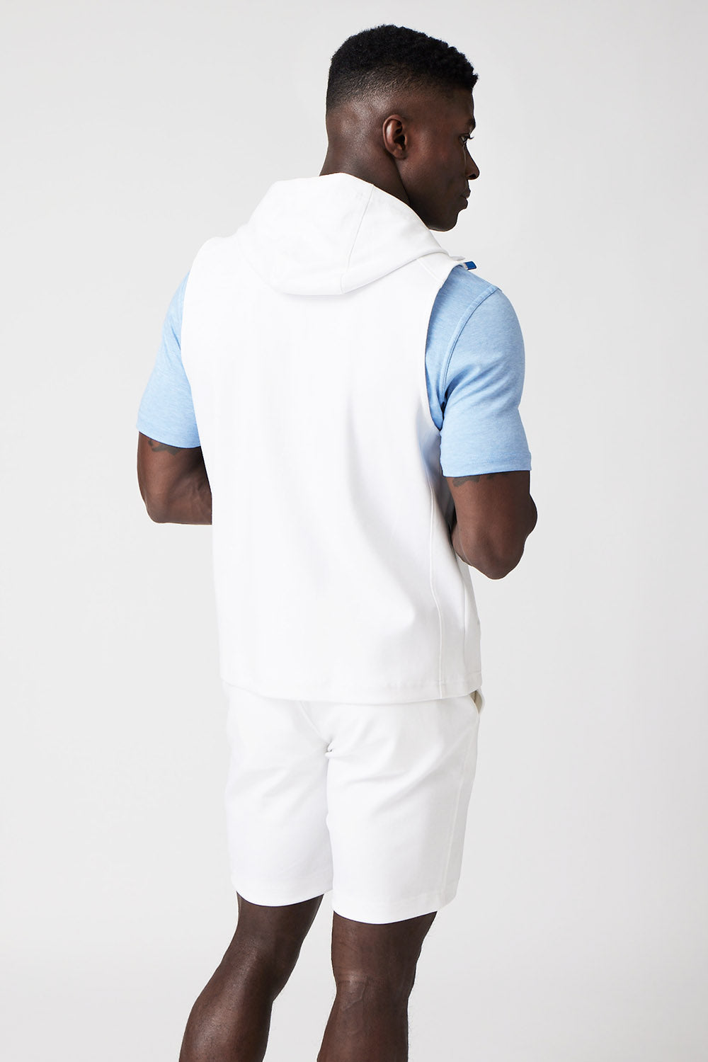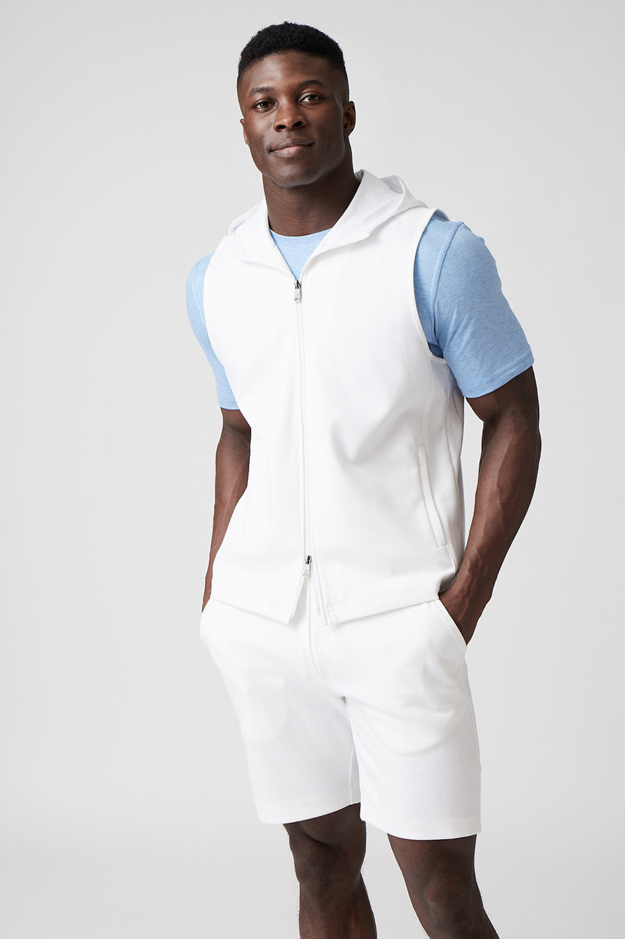 The Mason, is a full-zip sleeveless hoodie, made from our signature Aqua Cotton blend, a breathable material that stretches with you while maintaining its shape. Pair with the Noah or Josh and our best-selling Howard pants for a luxury streetwear look that is so comfortable you'll never want to wear anything else.