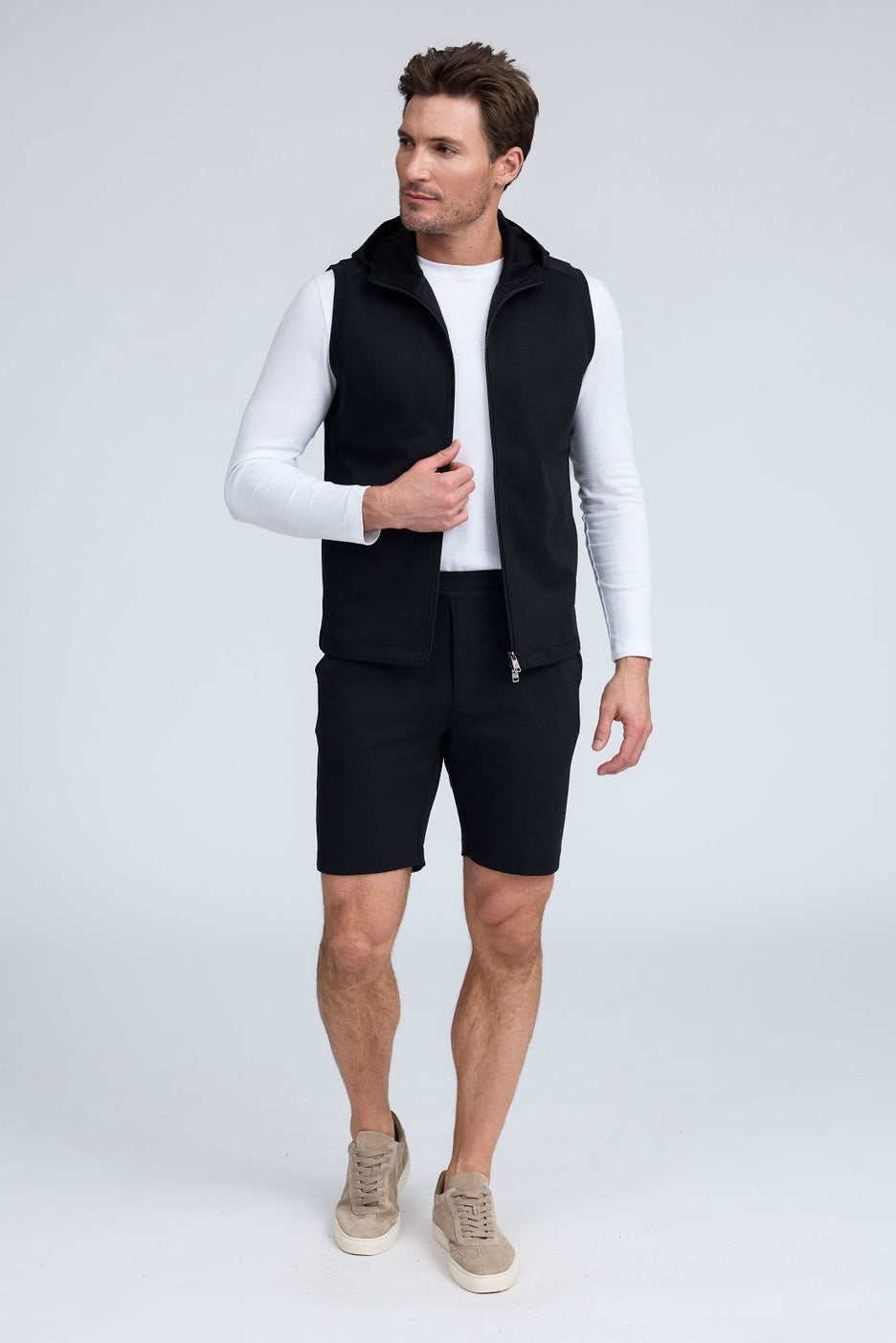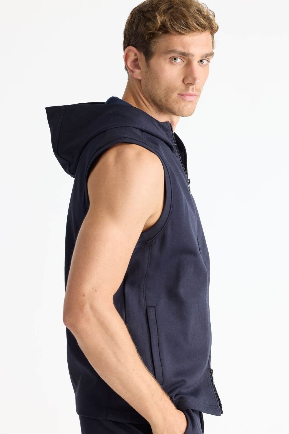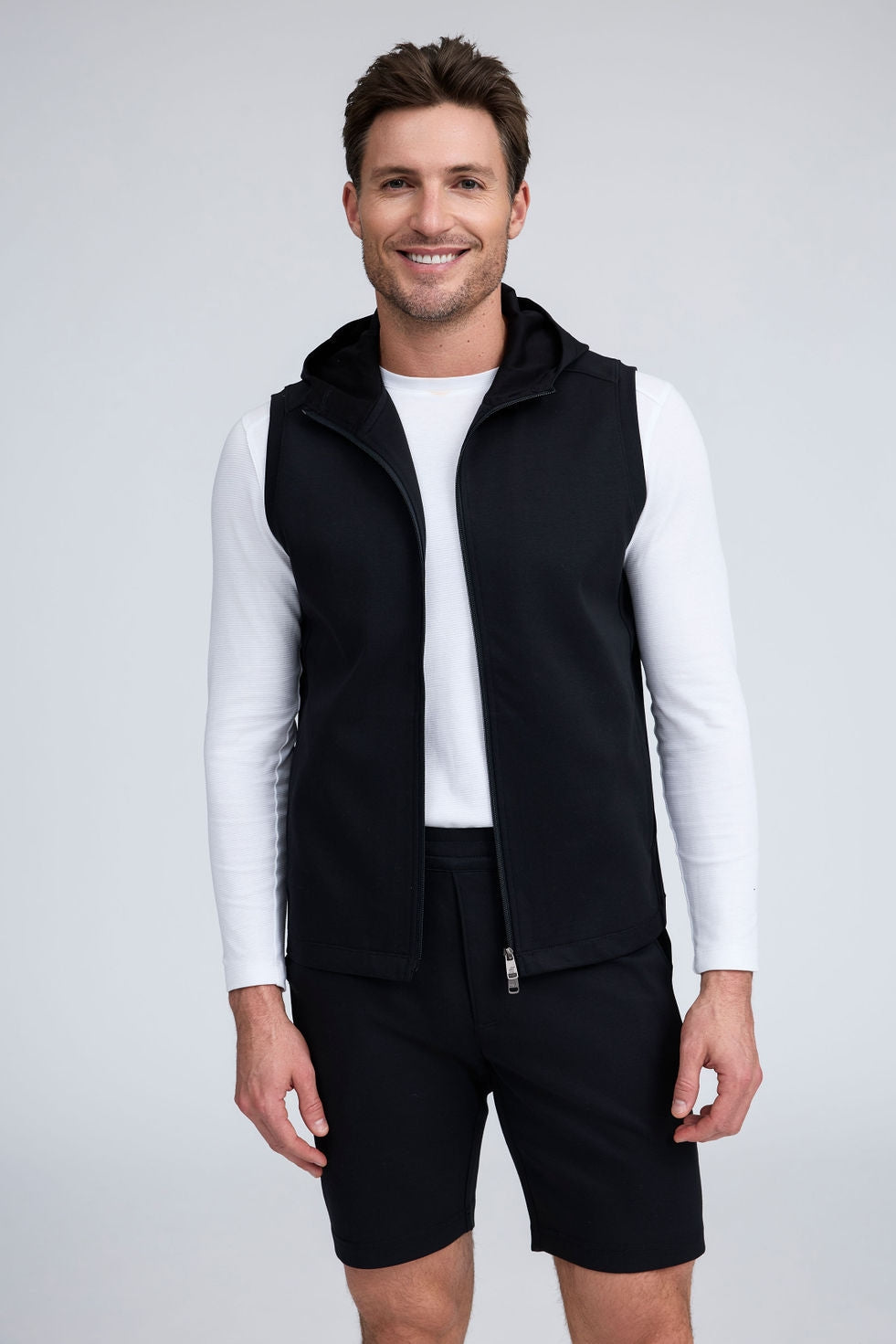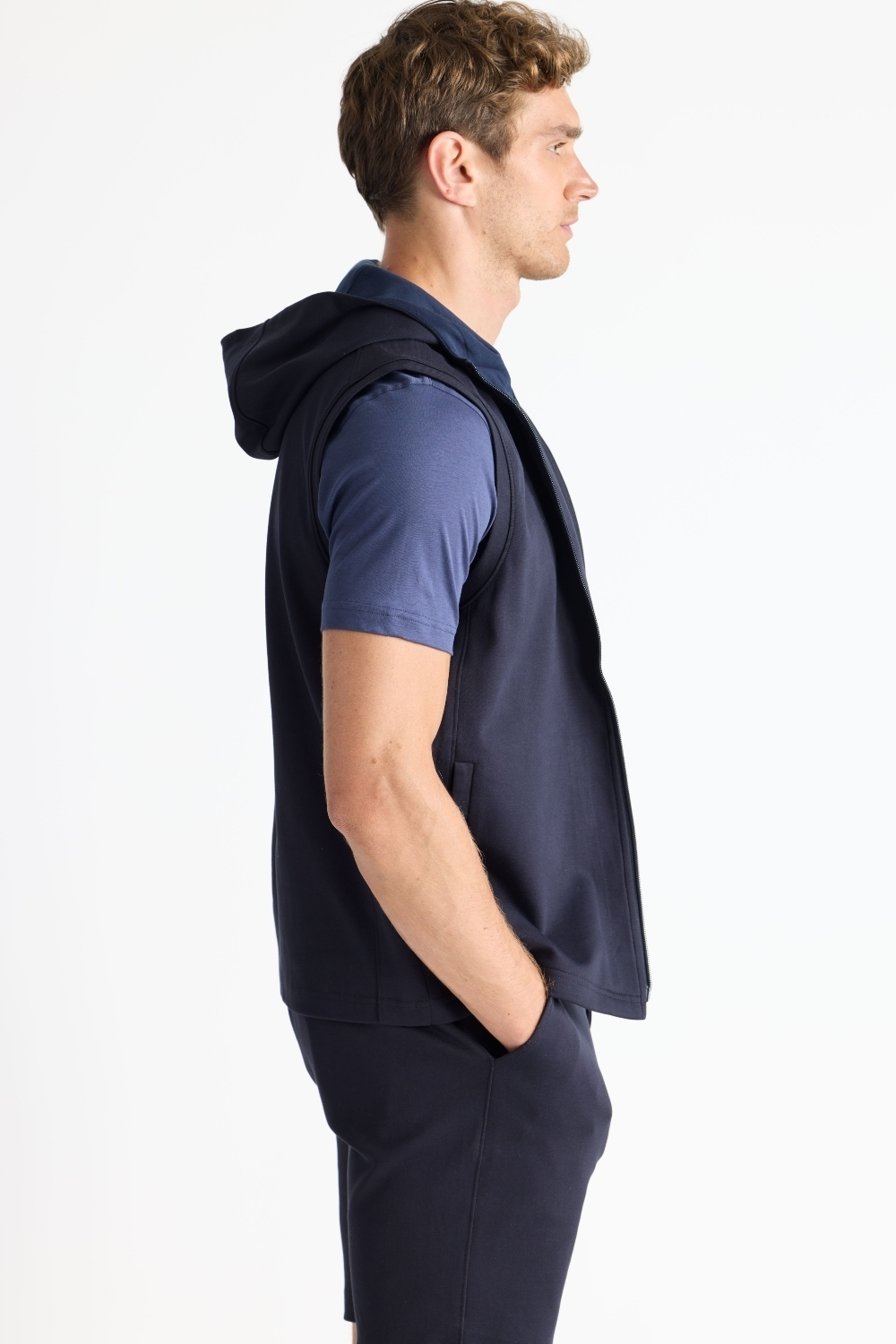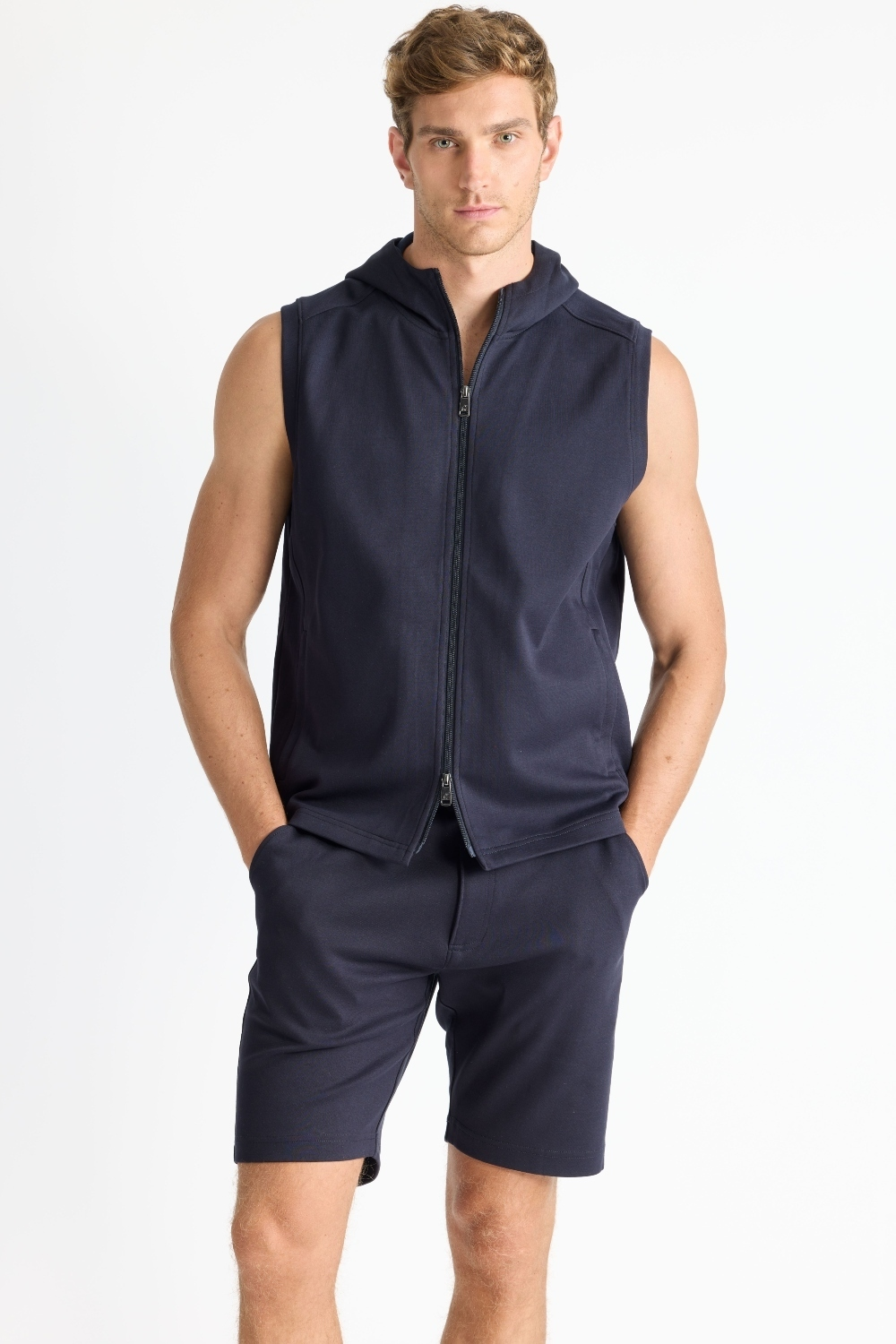 The Mason, is a full-zip sleeveless hoodie, made from our signature Aqua Cotton blend, a breathable material that stretches with you while maintaining its shape. Pair with the Noah or Josh and our best-selling Howard pants for a luxury streetwear look that is so comfortable you'll never want to wear anything else.