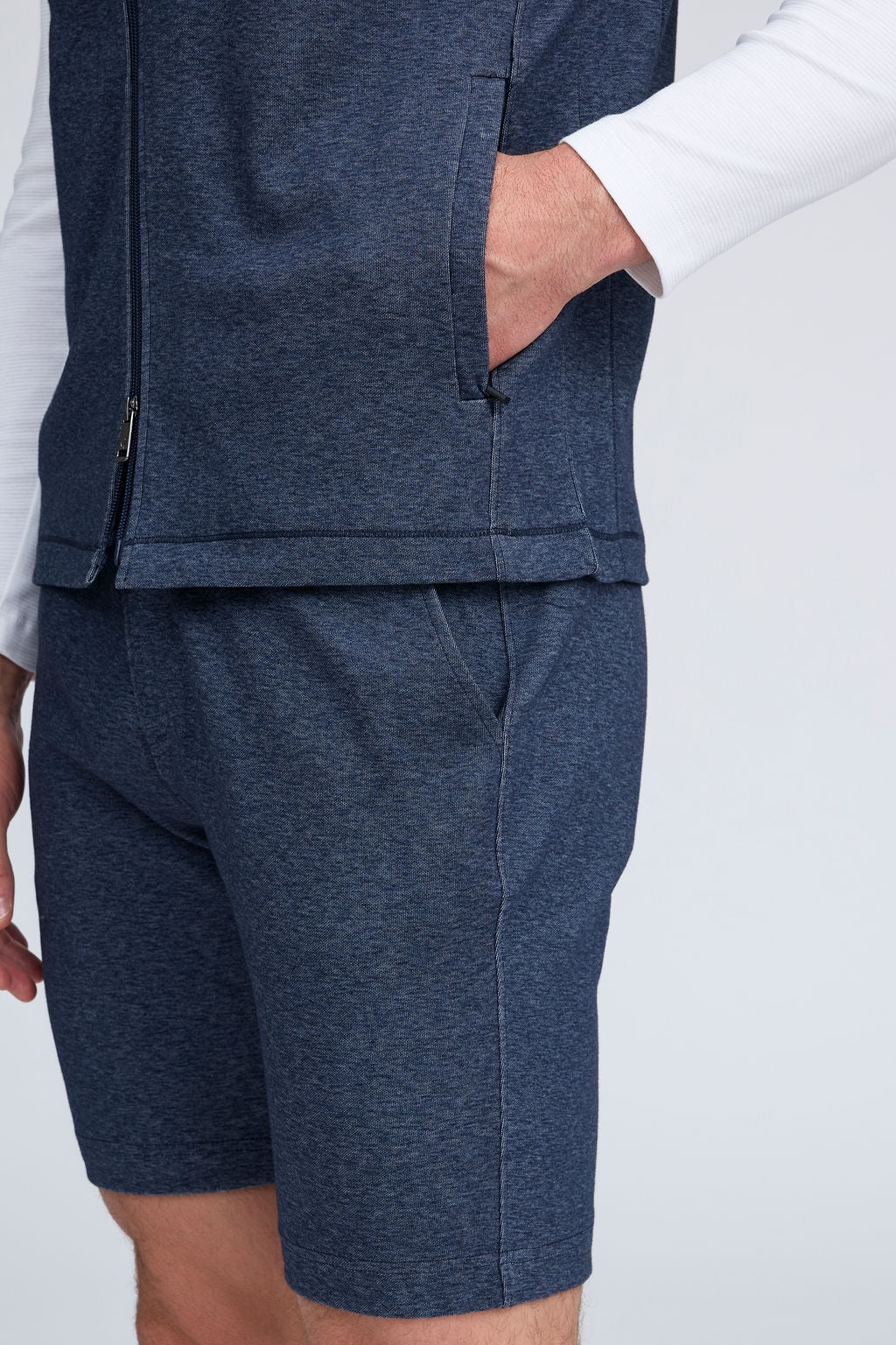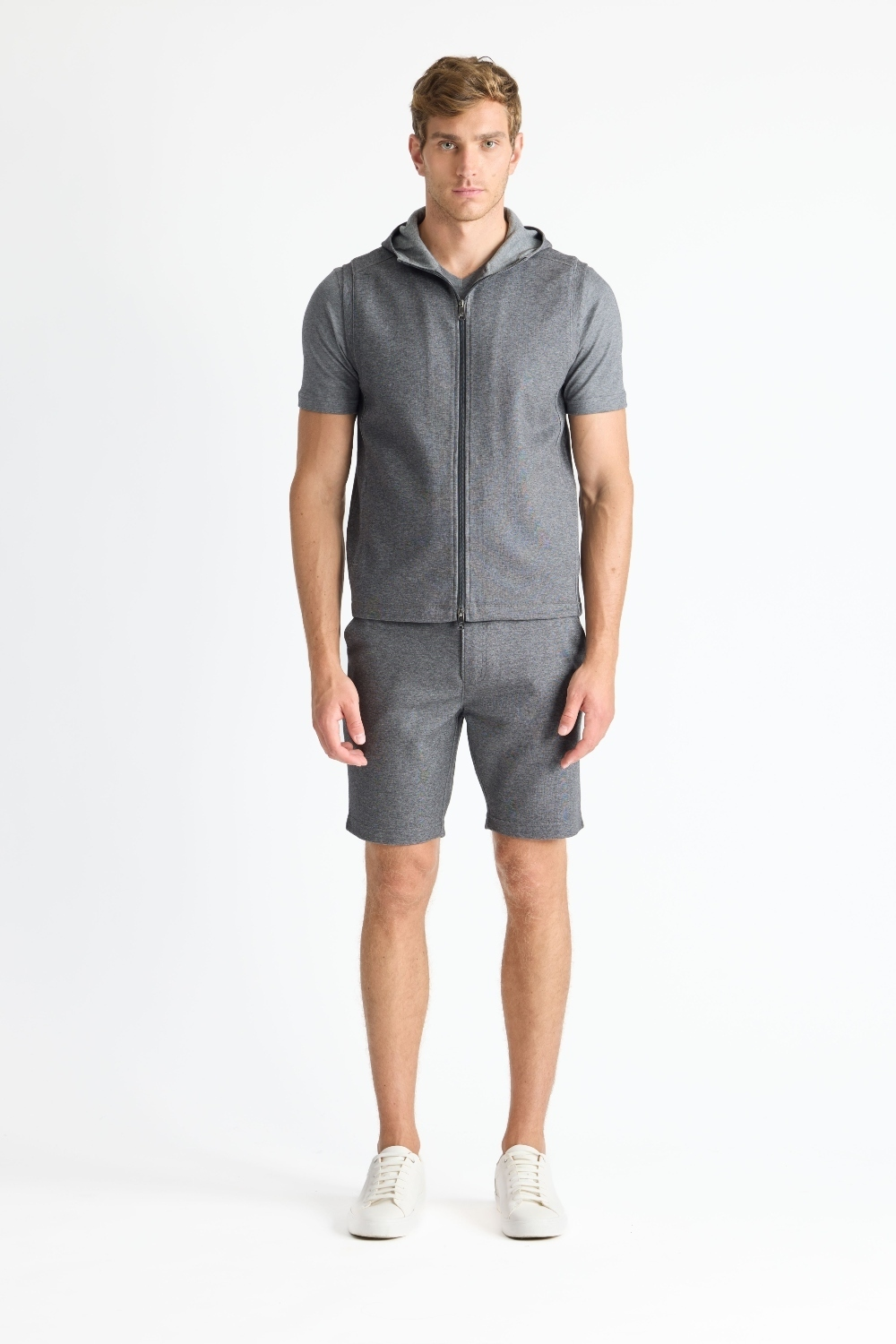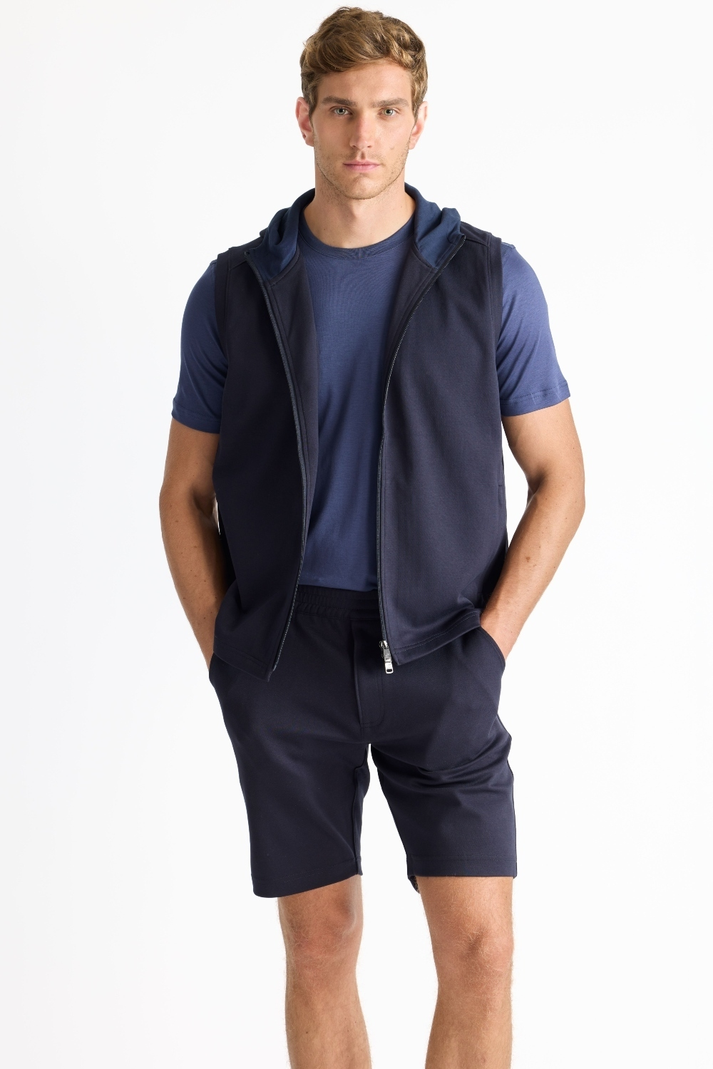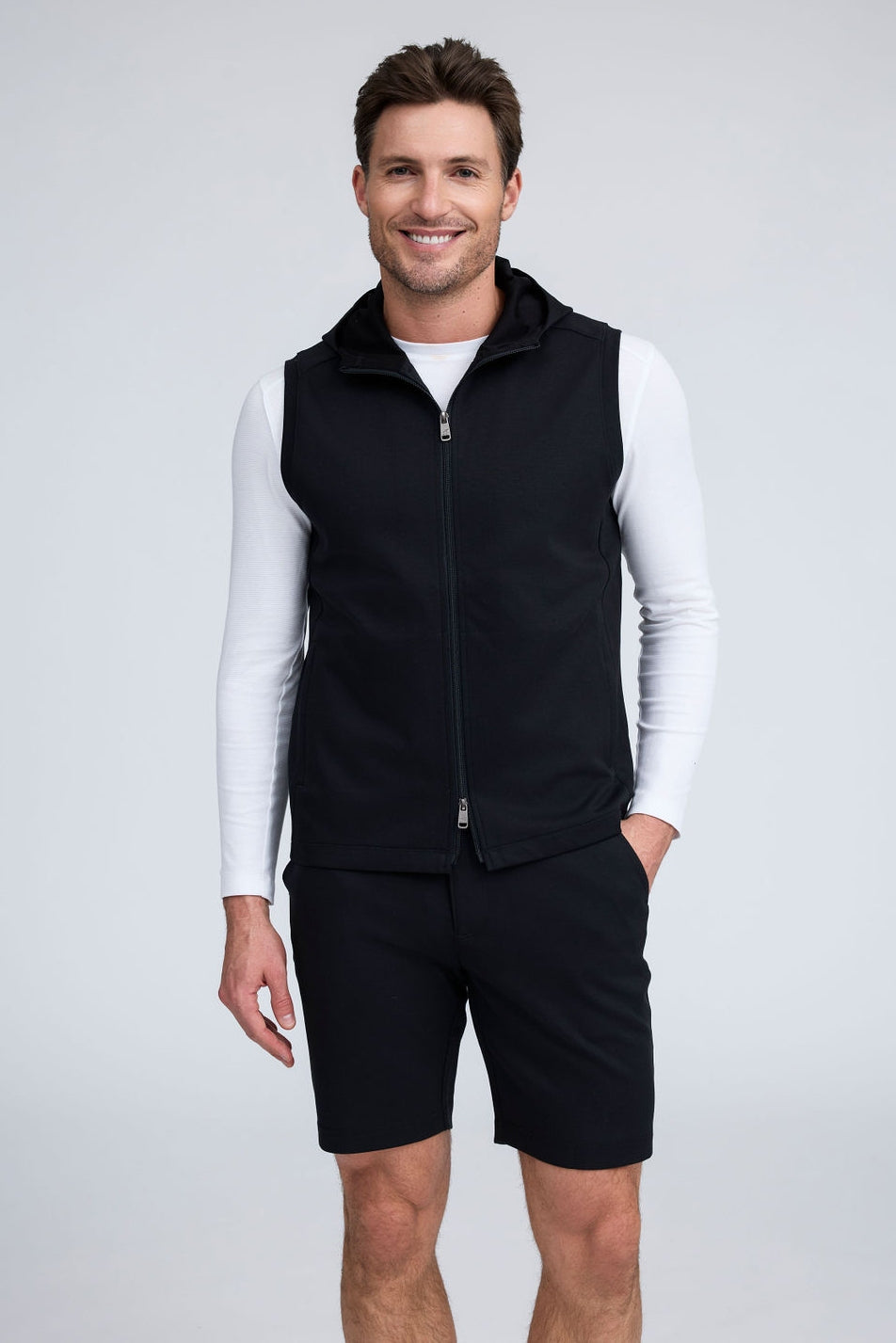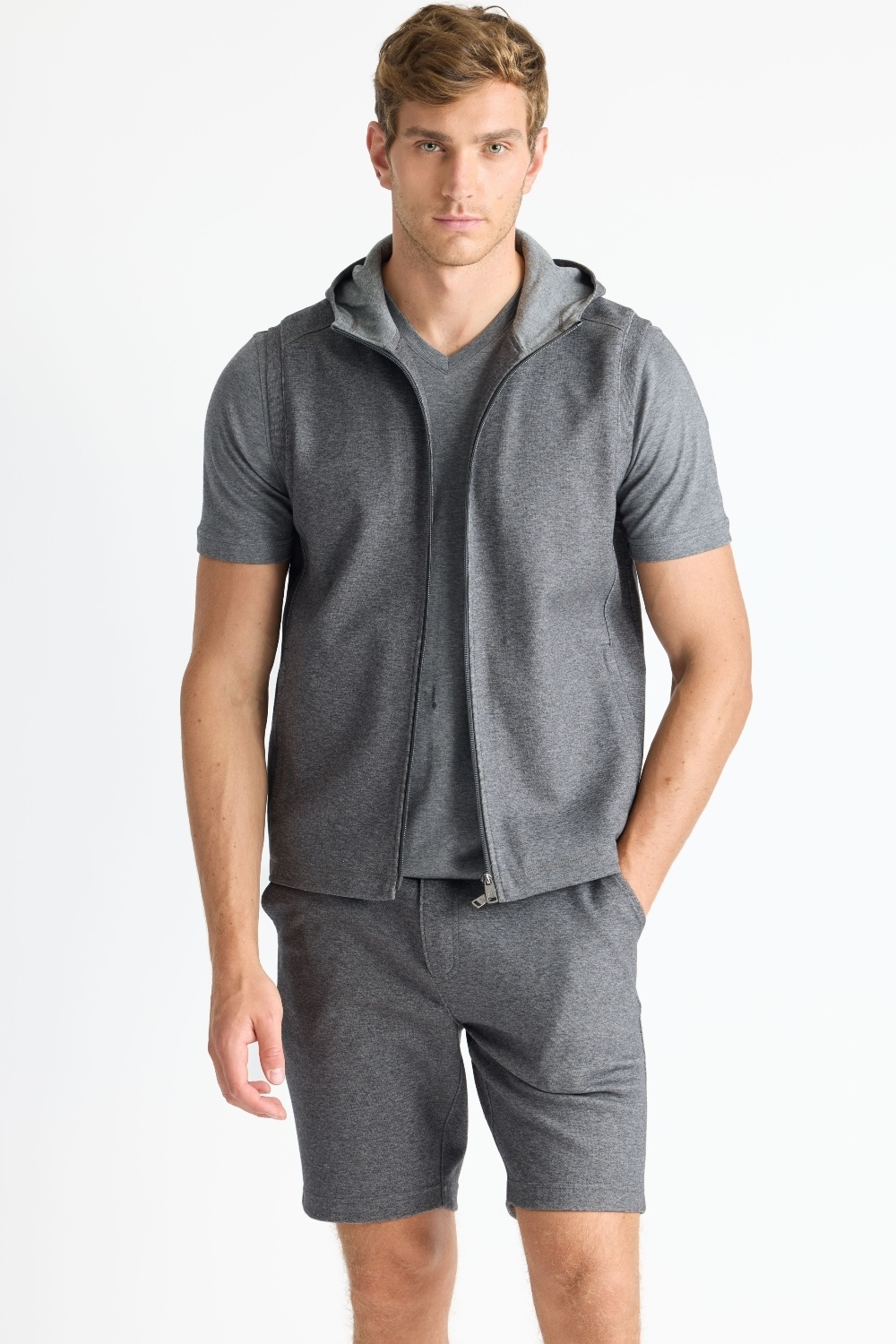 The Mason, is a full-zip sleeveless hoodie, made from our signature Aqua Cotton blend, a breathable material that stretches with you while maintaining its shape. Pair with the Noah or Josh and our best-selling Howard pants for a luxury streetwear look that is so comfortable you'll never want to wear anything else.