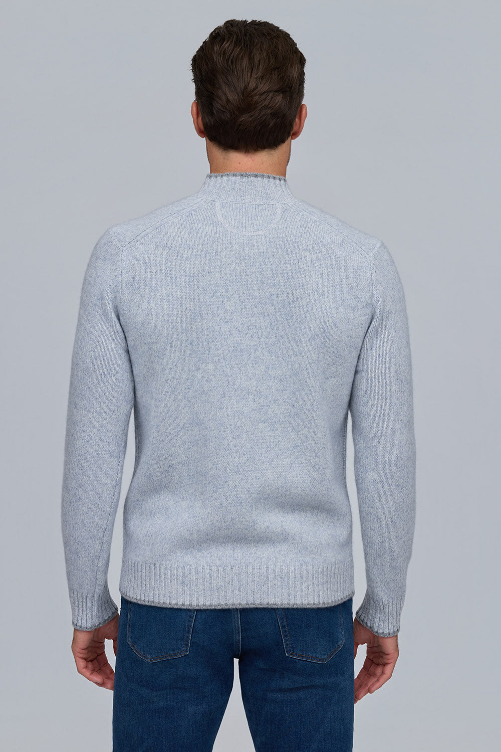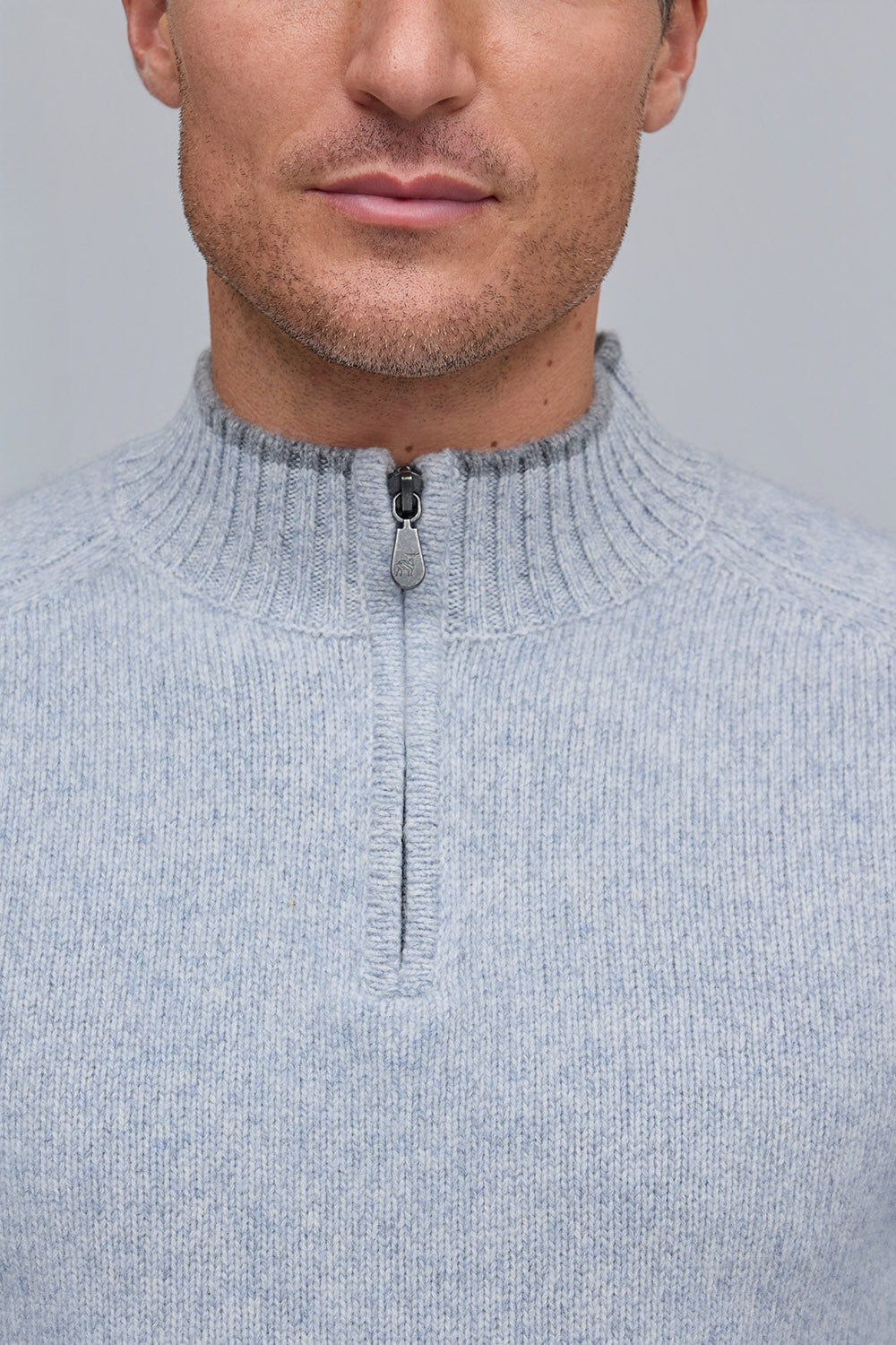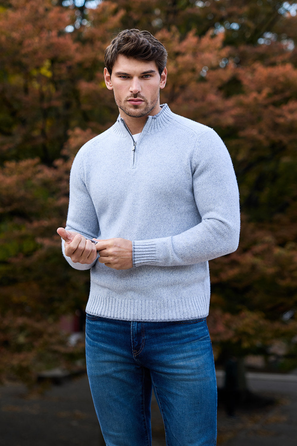 Spun from 70% wool and 30% cashmere, this zip mock neck sweater blends cozy warmth with modern refinement. In soft cloud mouline color with contrasting grey trim, it’s an elevated essential for effortless style.