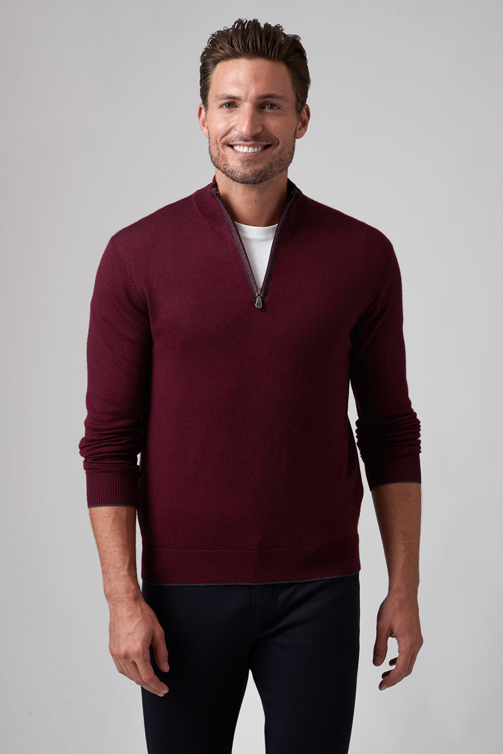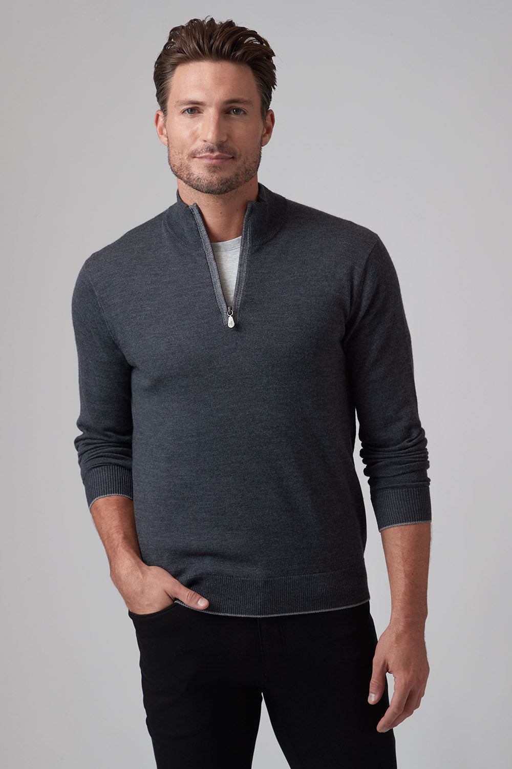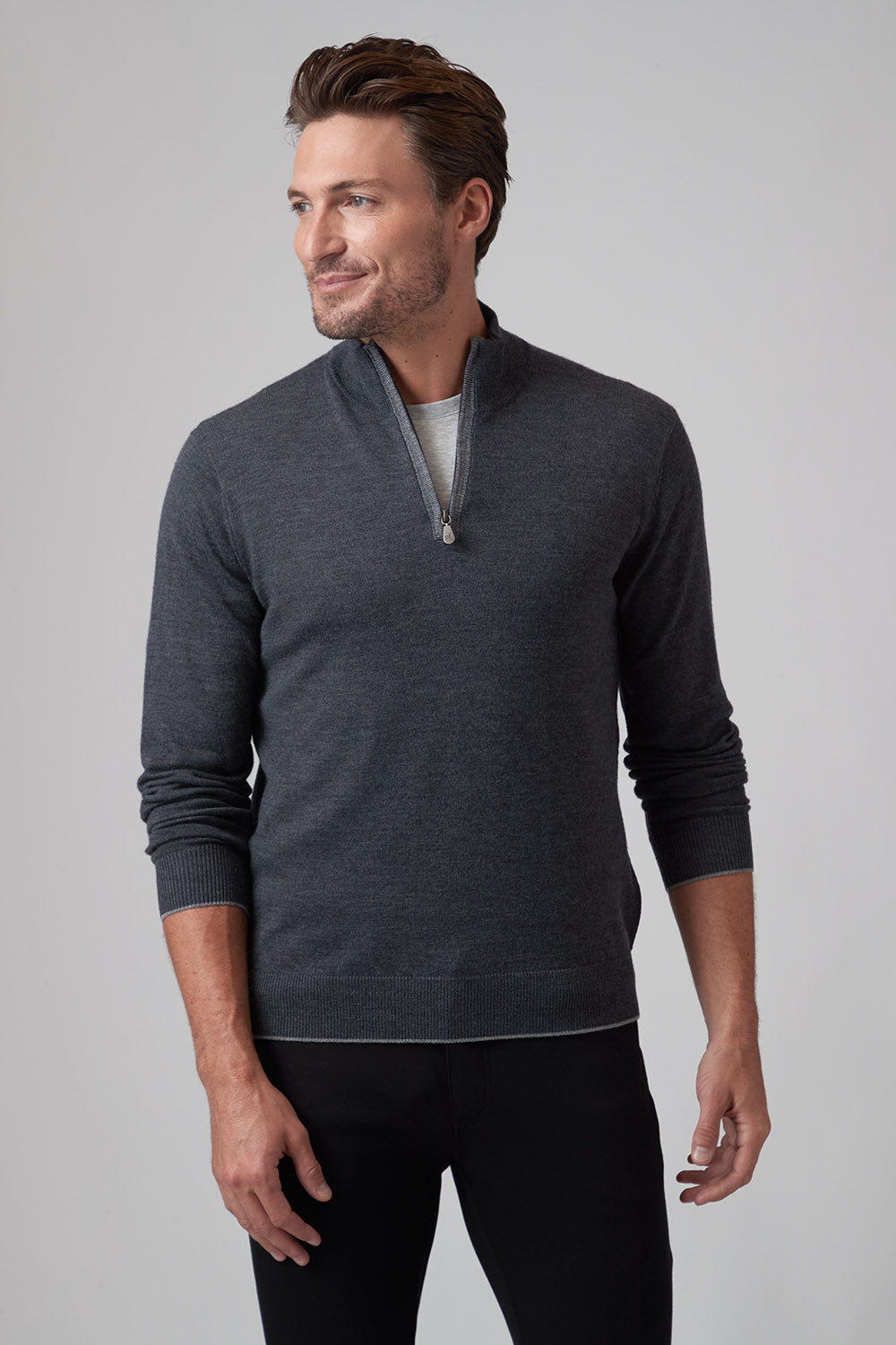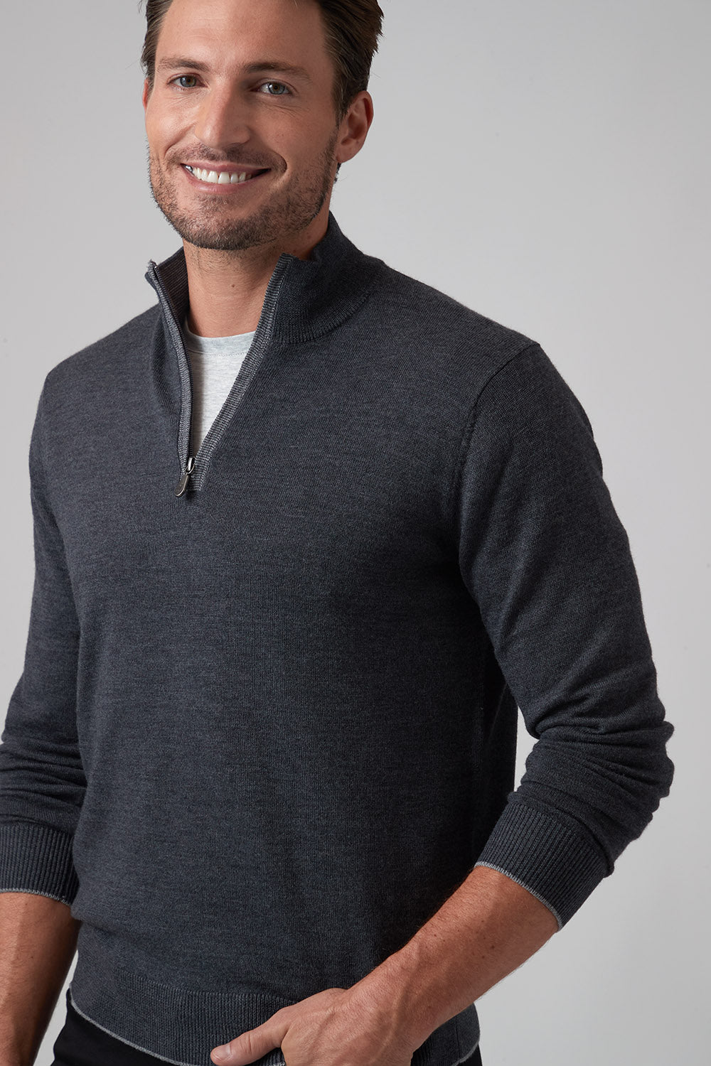The Palmer is our elevated zip mock neck sweater with subtle tonal trim detail on the placket, hem, and cuff, and designed in 100% Extrafine Merino Wool. Style with any of our cotton-blend pants, Theo, Jasper, or Howard, for a contemporary look that will get you noticed.