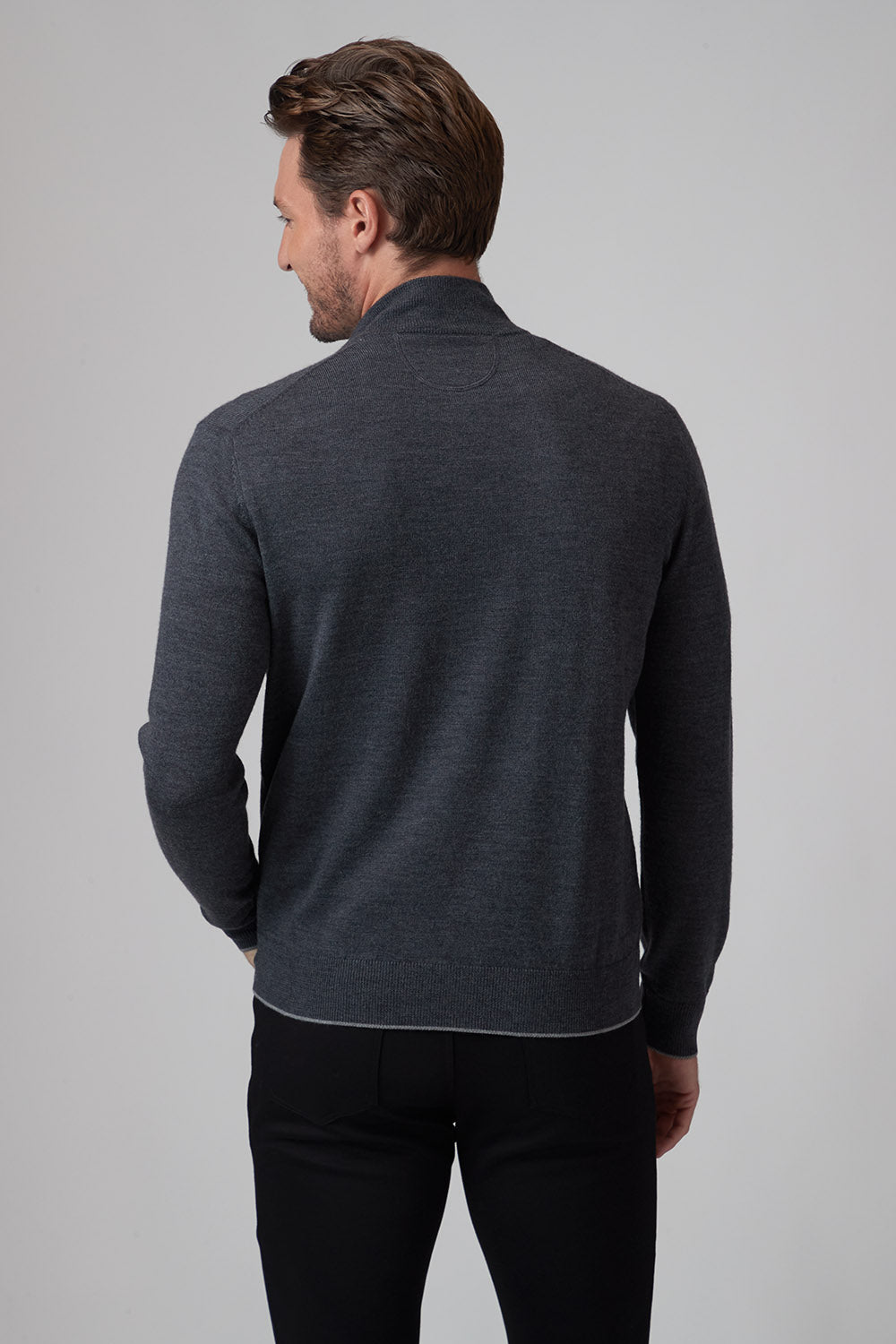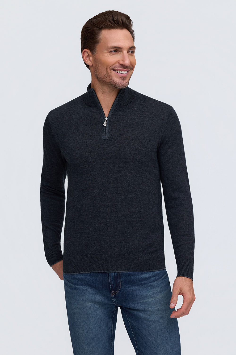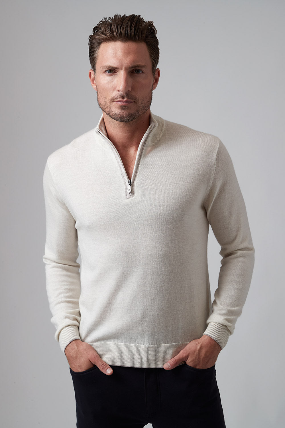 The Palmer is our elevated zip mock neck sweater with subtle tonal trim detail on the placket, hem, and cuff, and designed in 100% Extrafine Merino Wool. Style with any of our cotton-blend pants, Theo, Jasper, or Howard, for a contemporary look that will get you noticed.