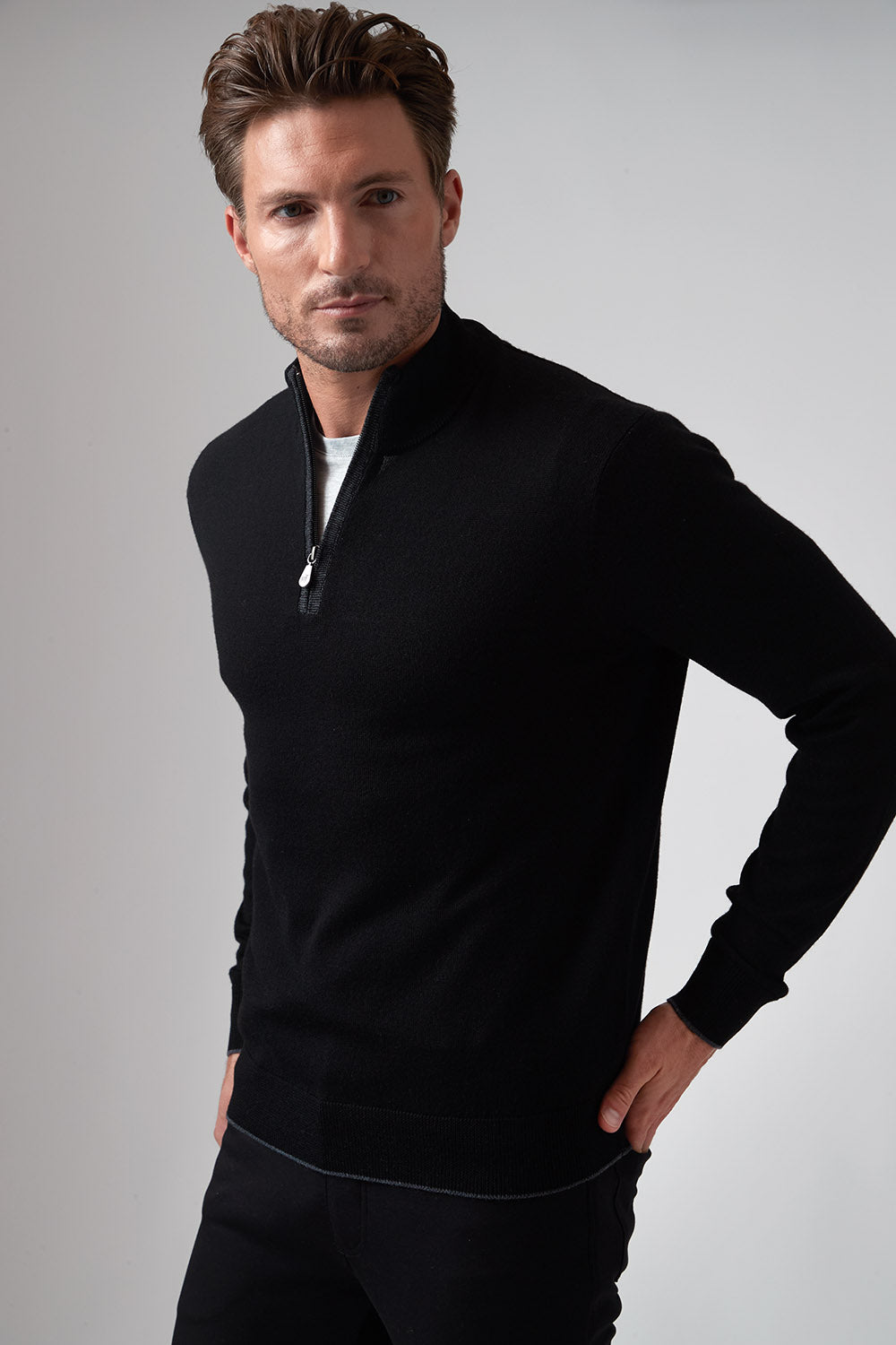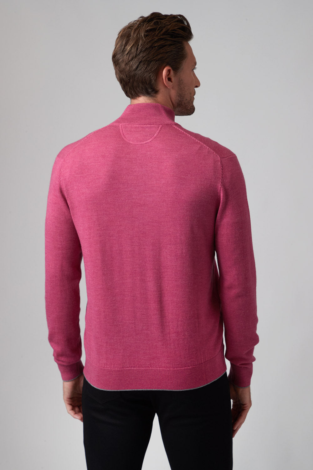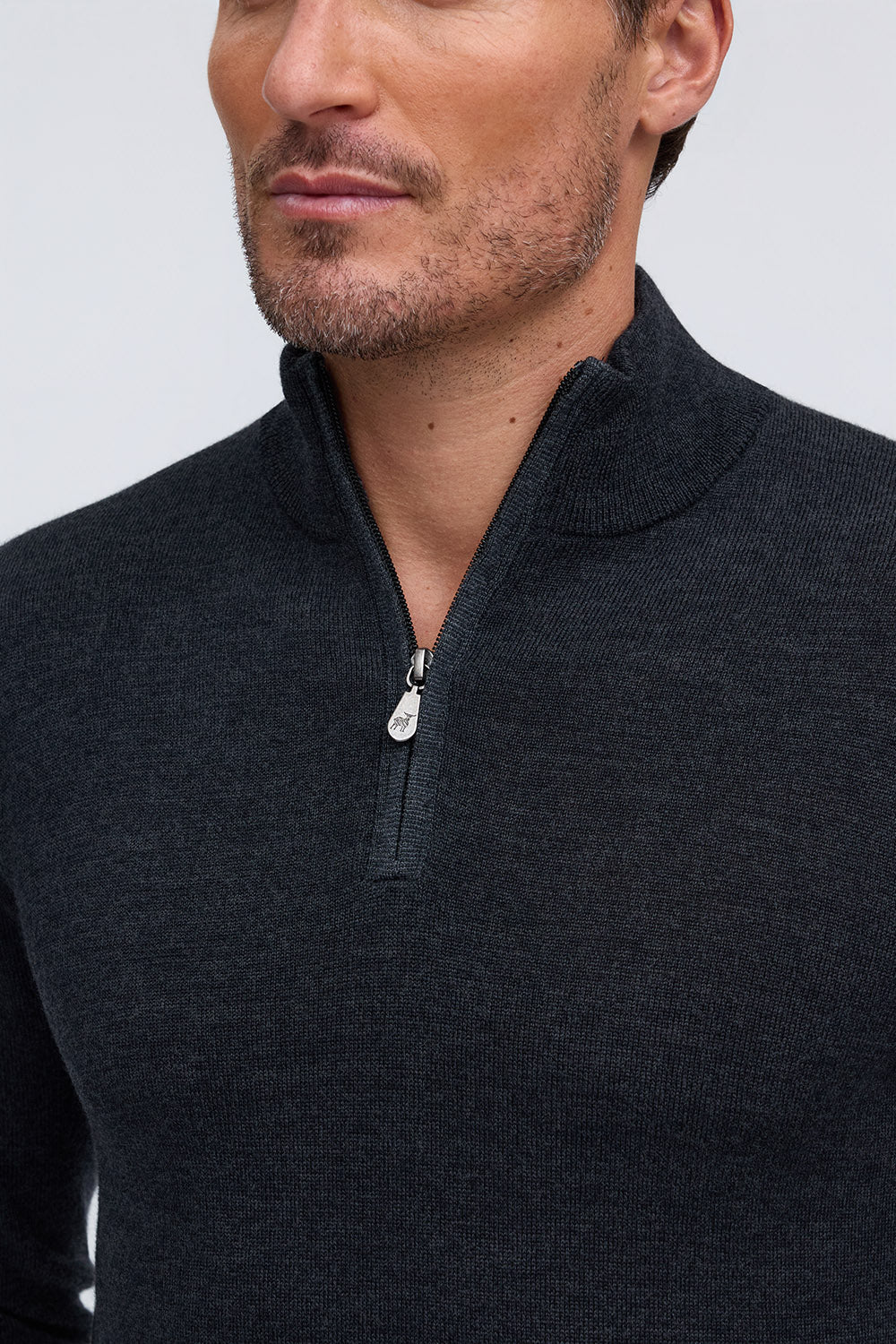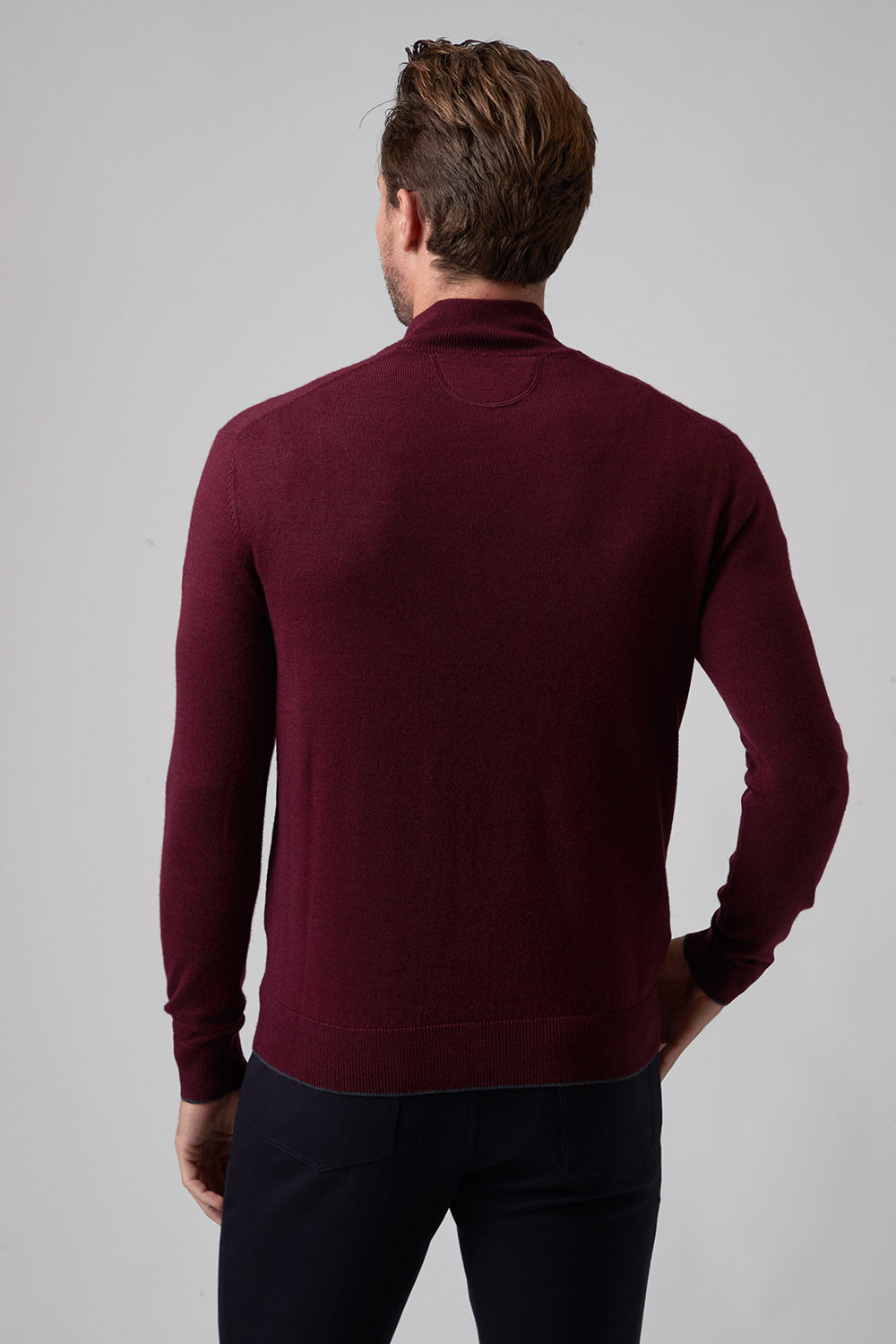 The Palmer is our elevated zip mock neck sweater with subtle tonal trim detail on the placket, hem, and cuff, and designed in 100% Extrafine Merino Wool. Style with any of our cotton-blend pants, Theo, Jasper, or Howard, for a contemporary look that will get you noticed.