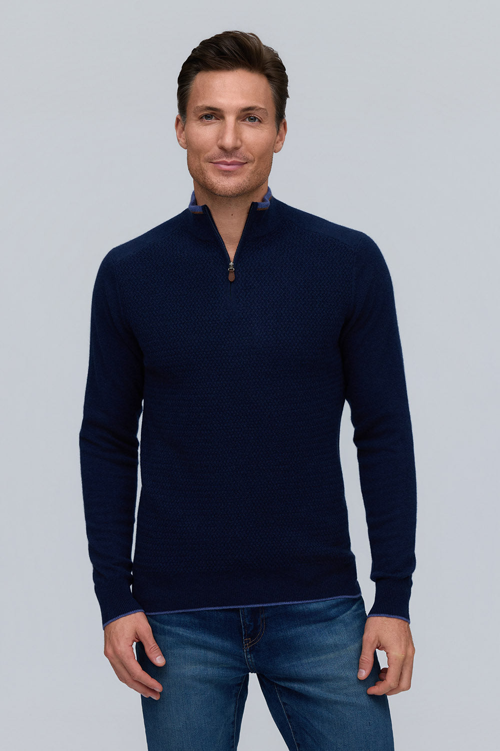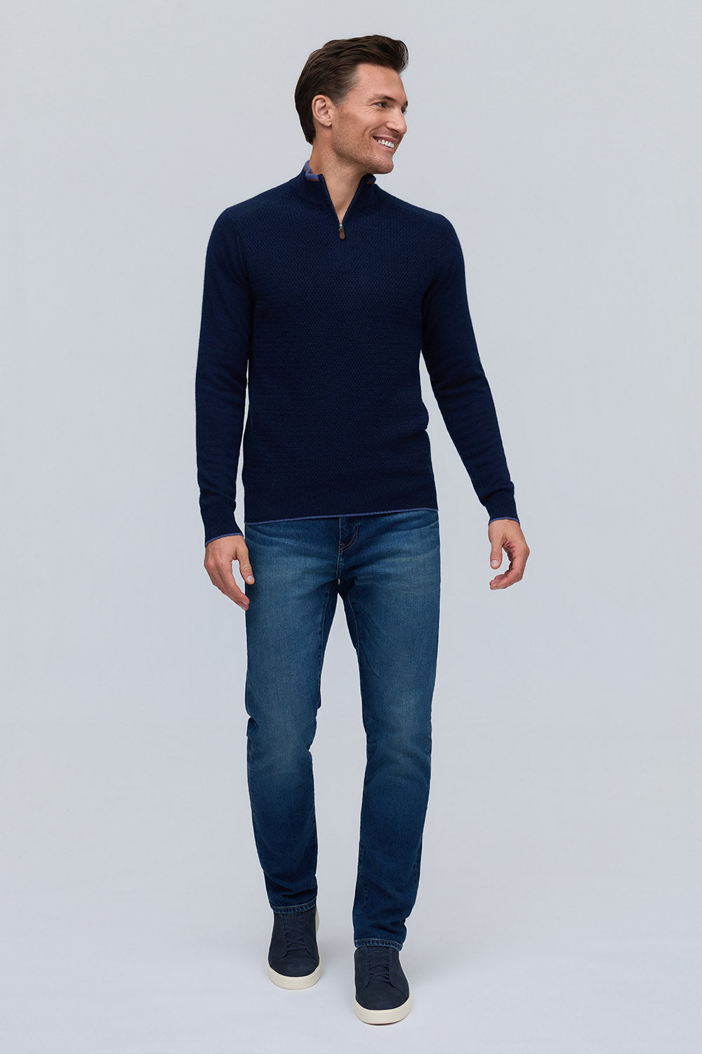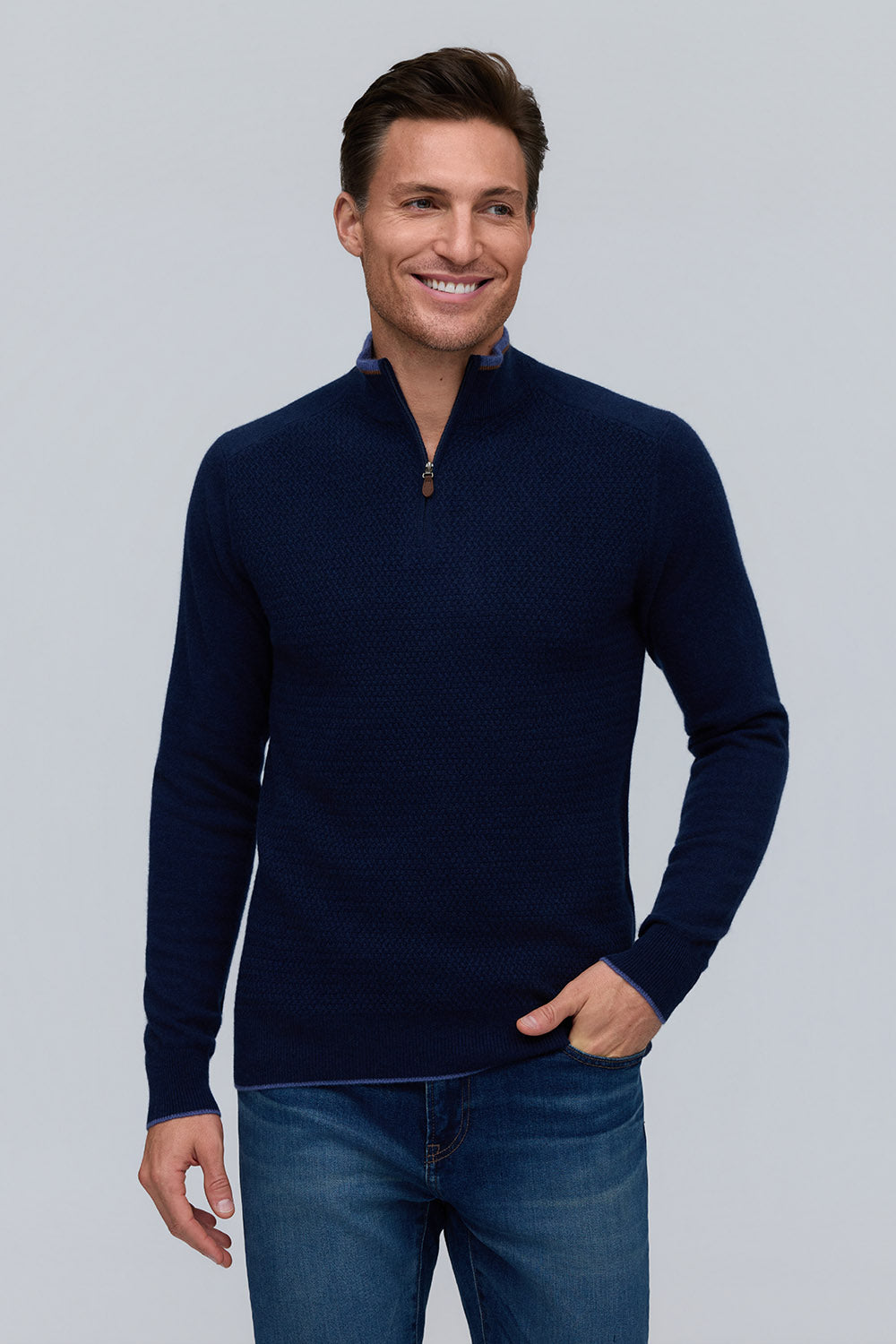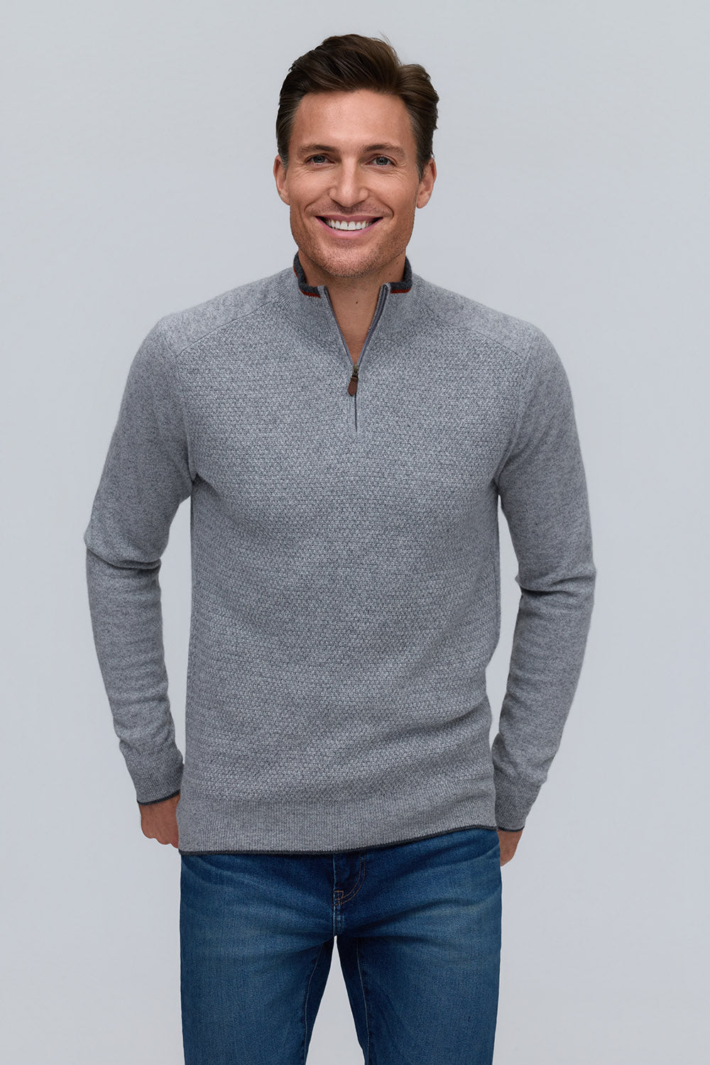 Crafted from 100% pure cashmere, this zip mock sweater blends exceptional softness and warmth with a sleek silhouette. Subtle front texture and tailored trims create an elevated essential of refined style.