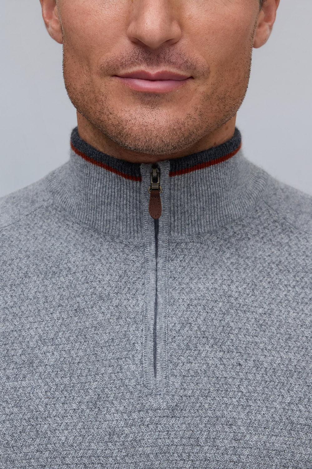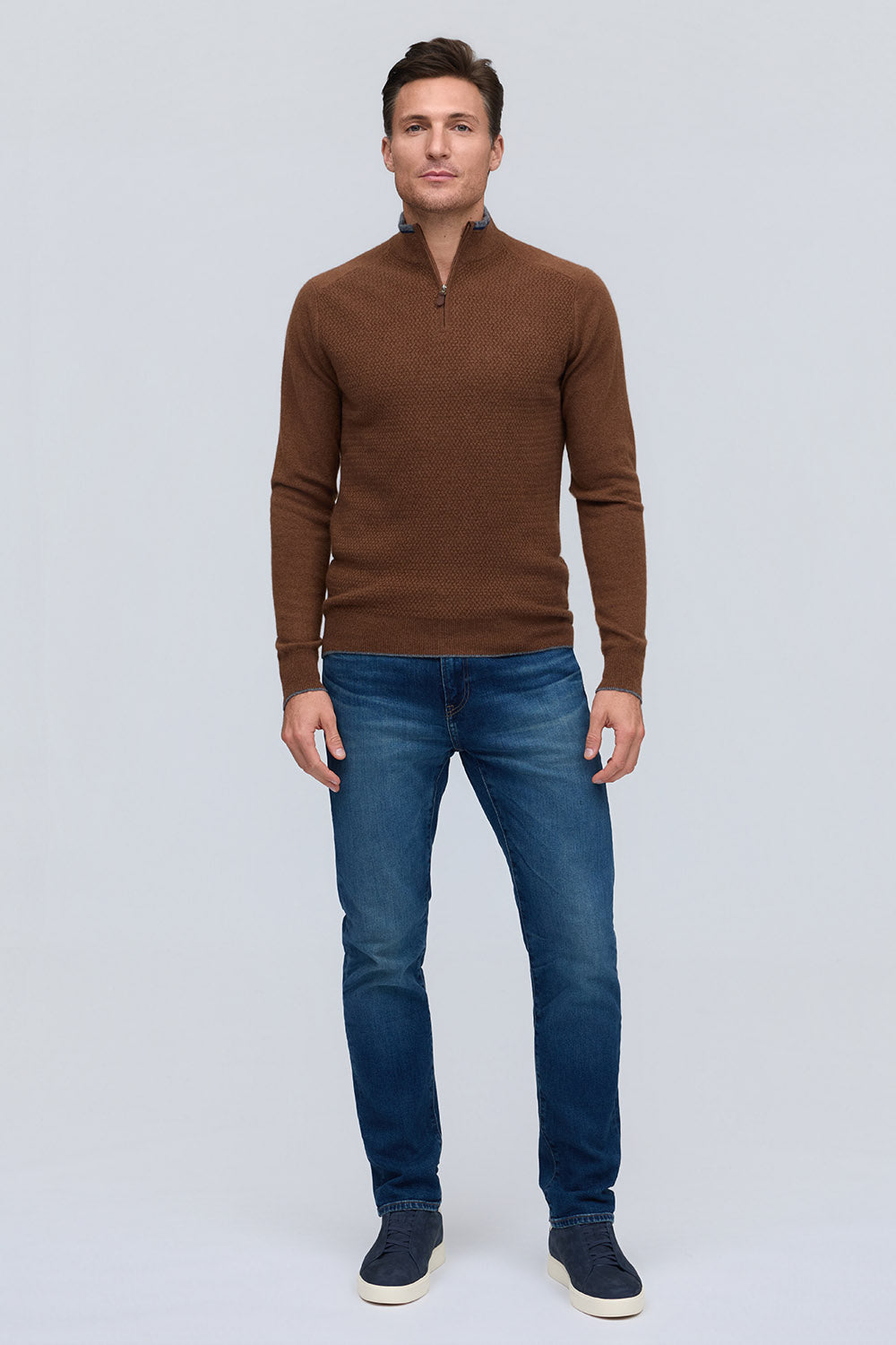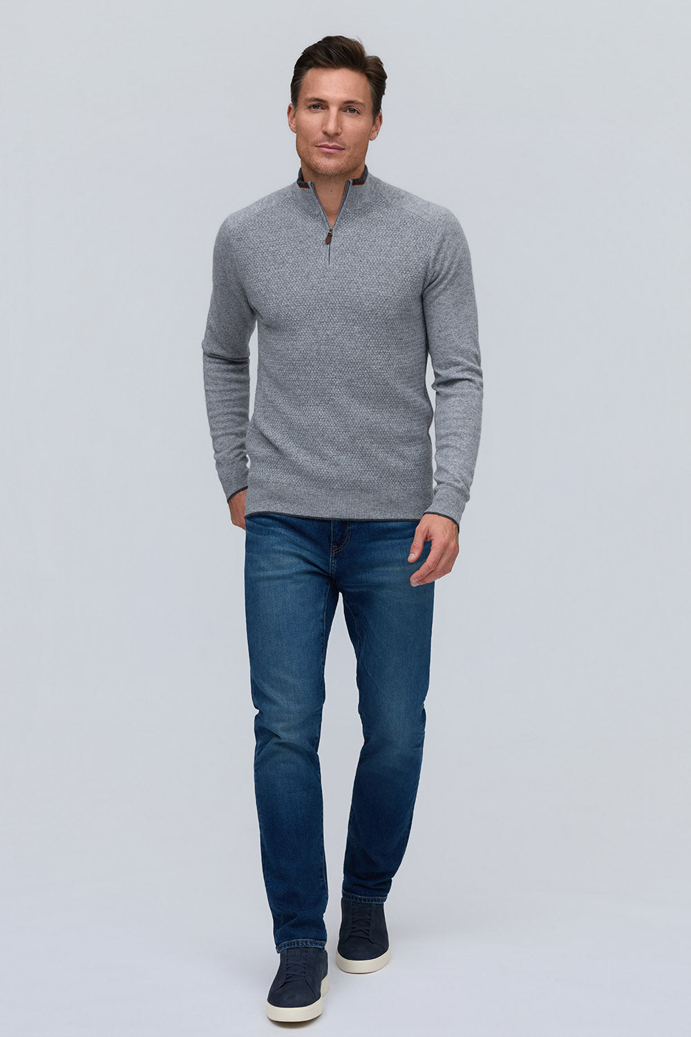 Crafted from 100% pure cashmere, this zip mock sweater blends exceptional softness and warmth with a sleek silhouette. Subtle front texture and tailored trims create an elevated essential of refined style.
