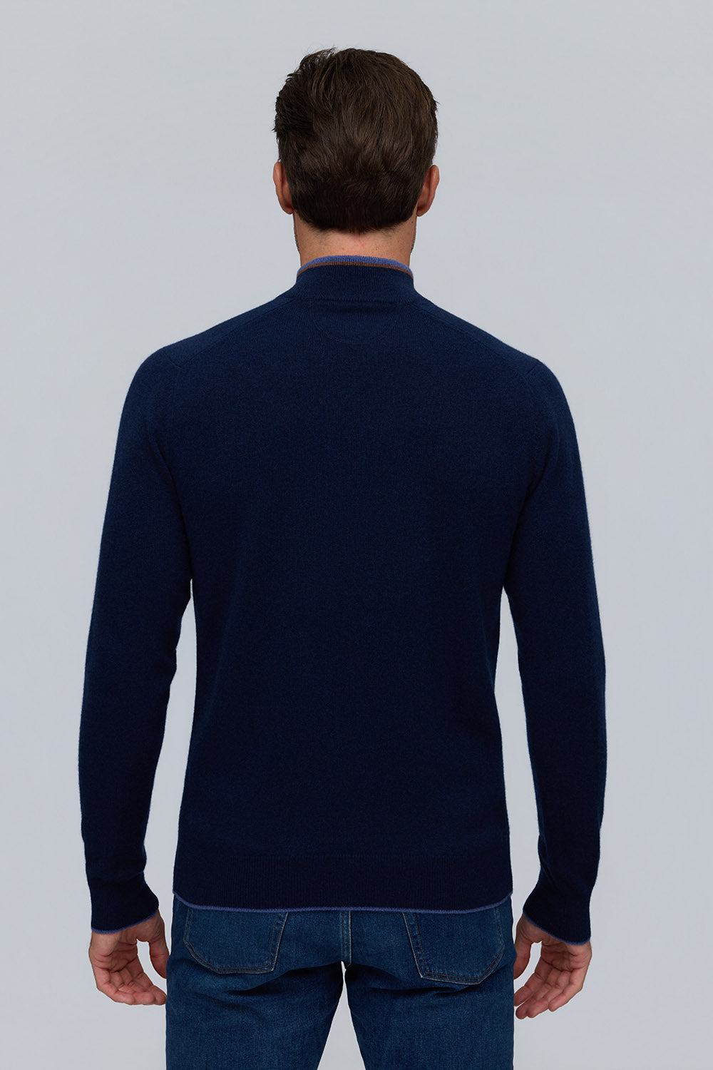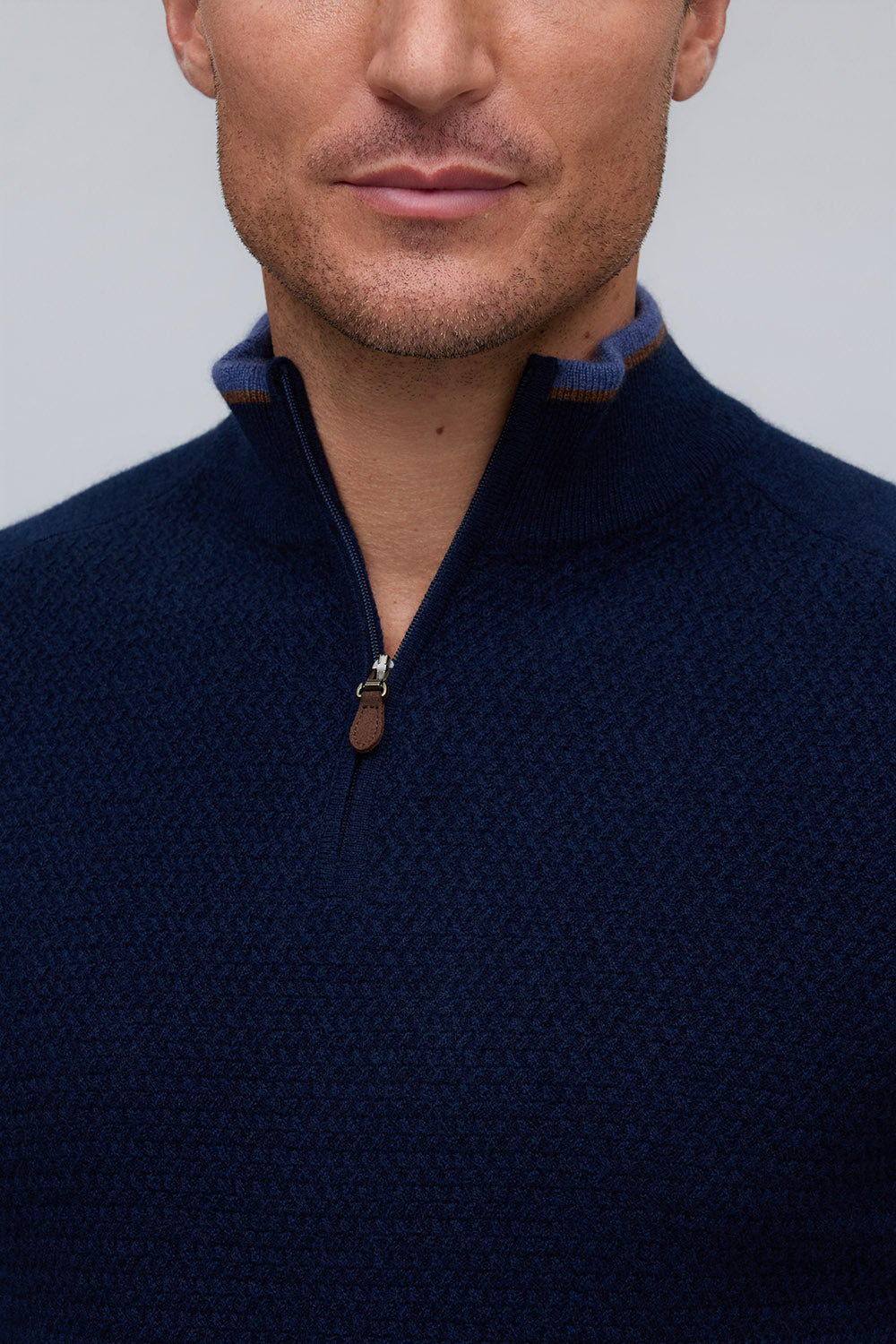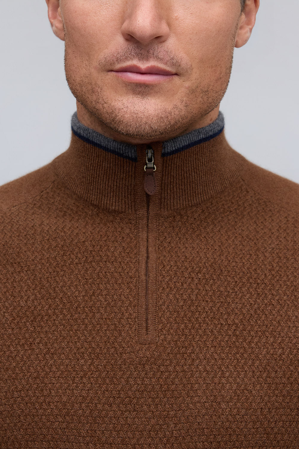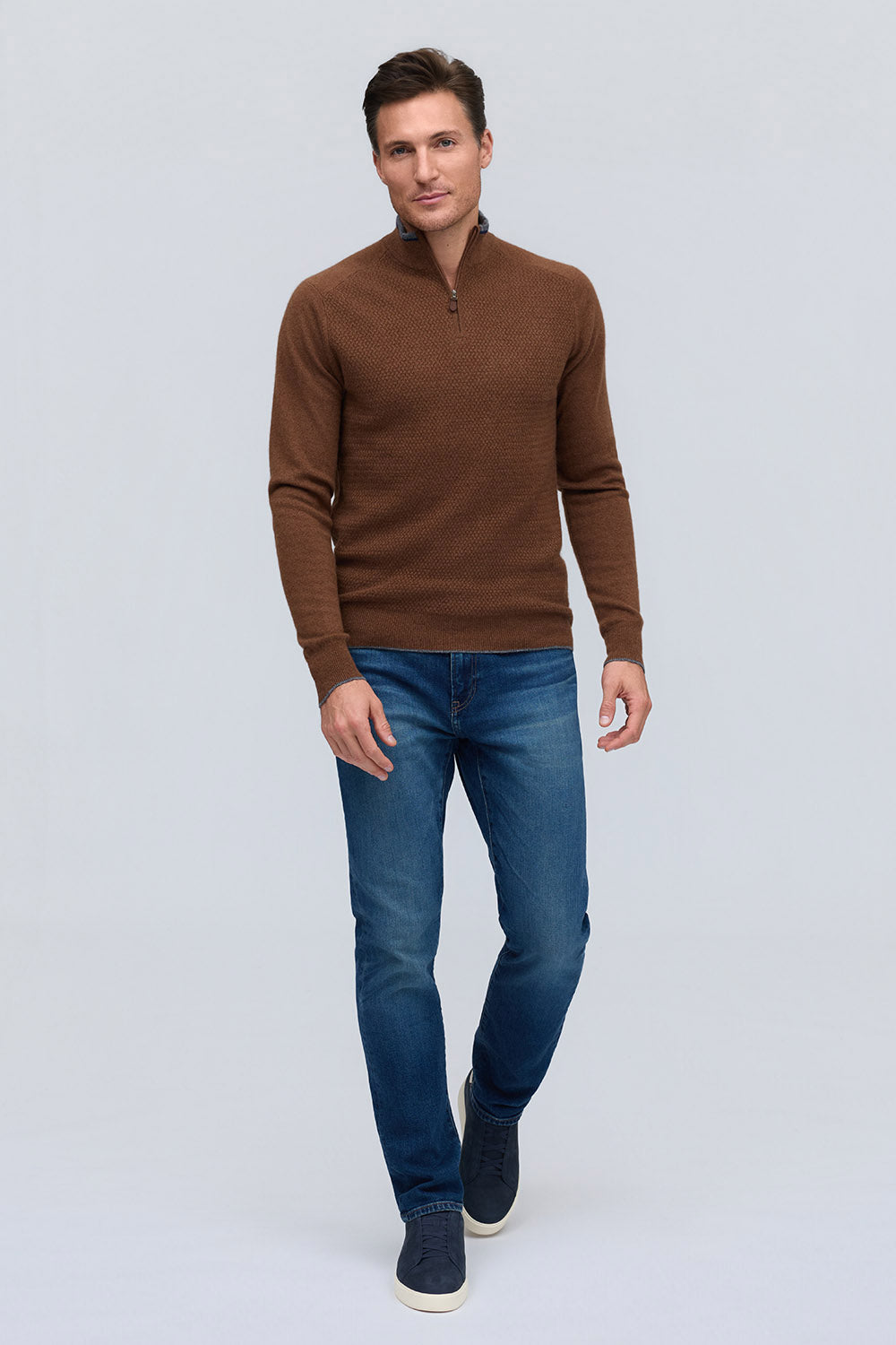 Crafted from 100% pure cashmere, this zip mock sweater blends exceptional softness and warmth with a sleek silhouette. Subtle front texture and tailored trims create an elevated essential of refined style.