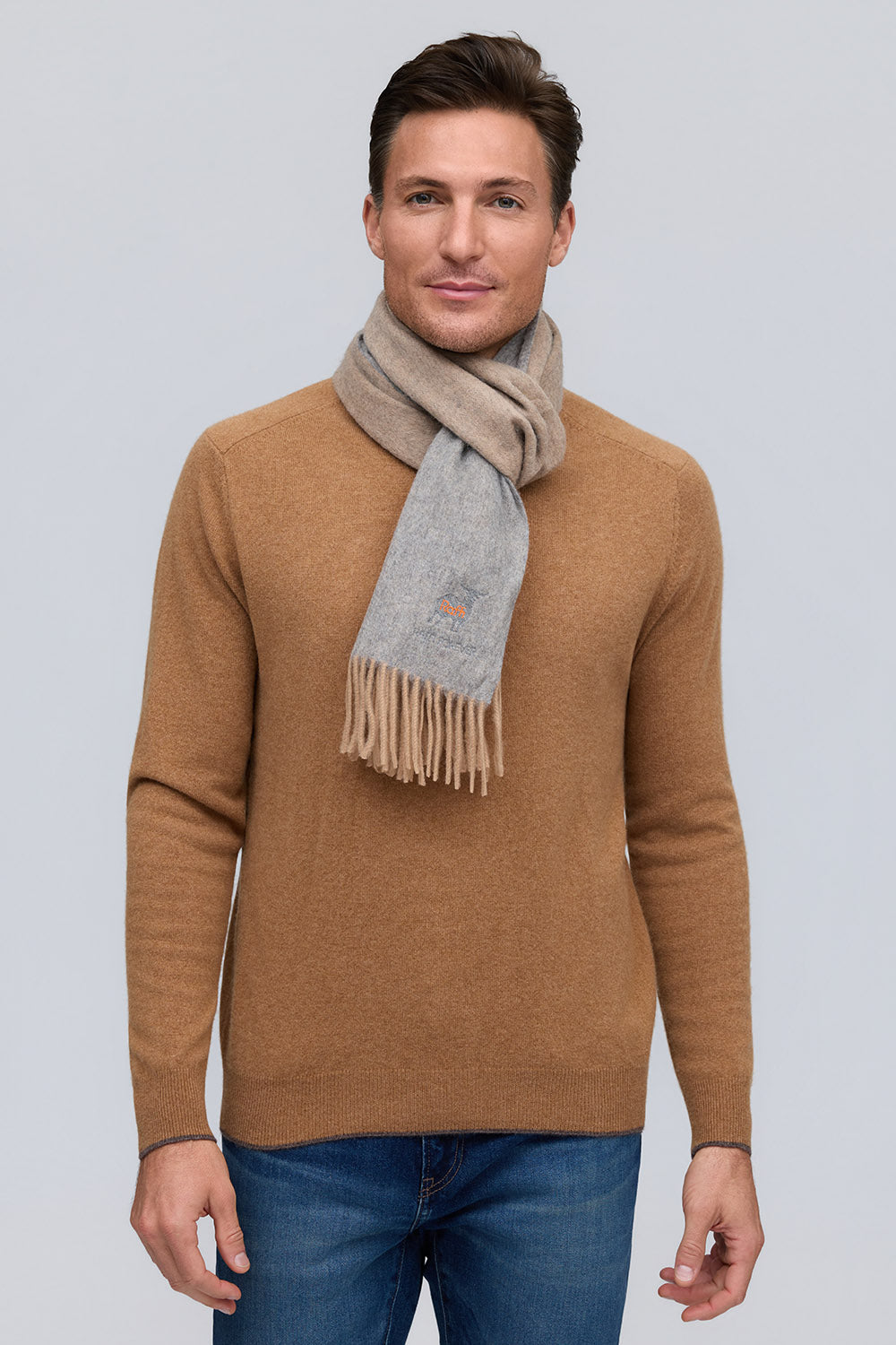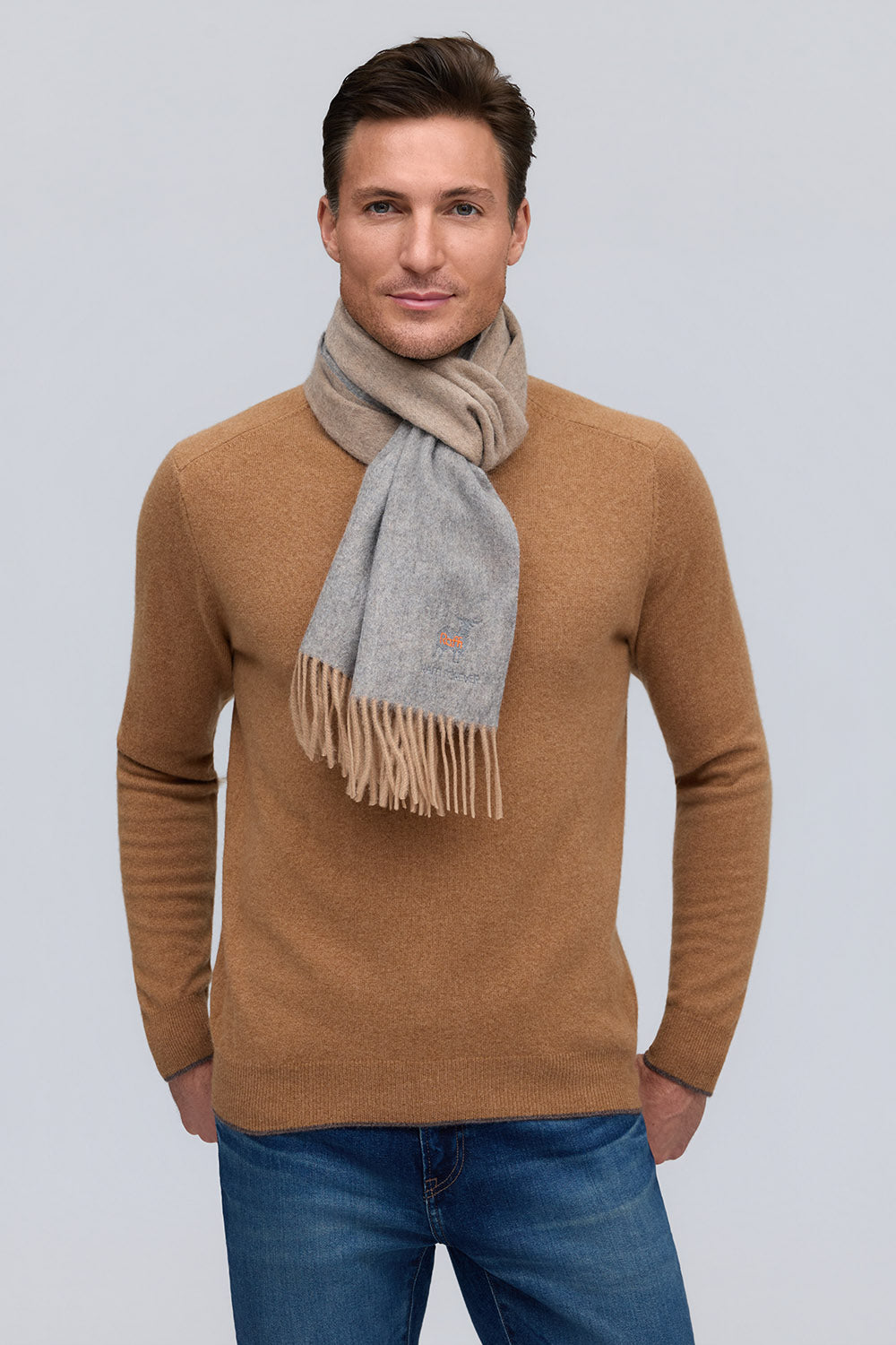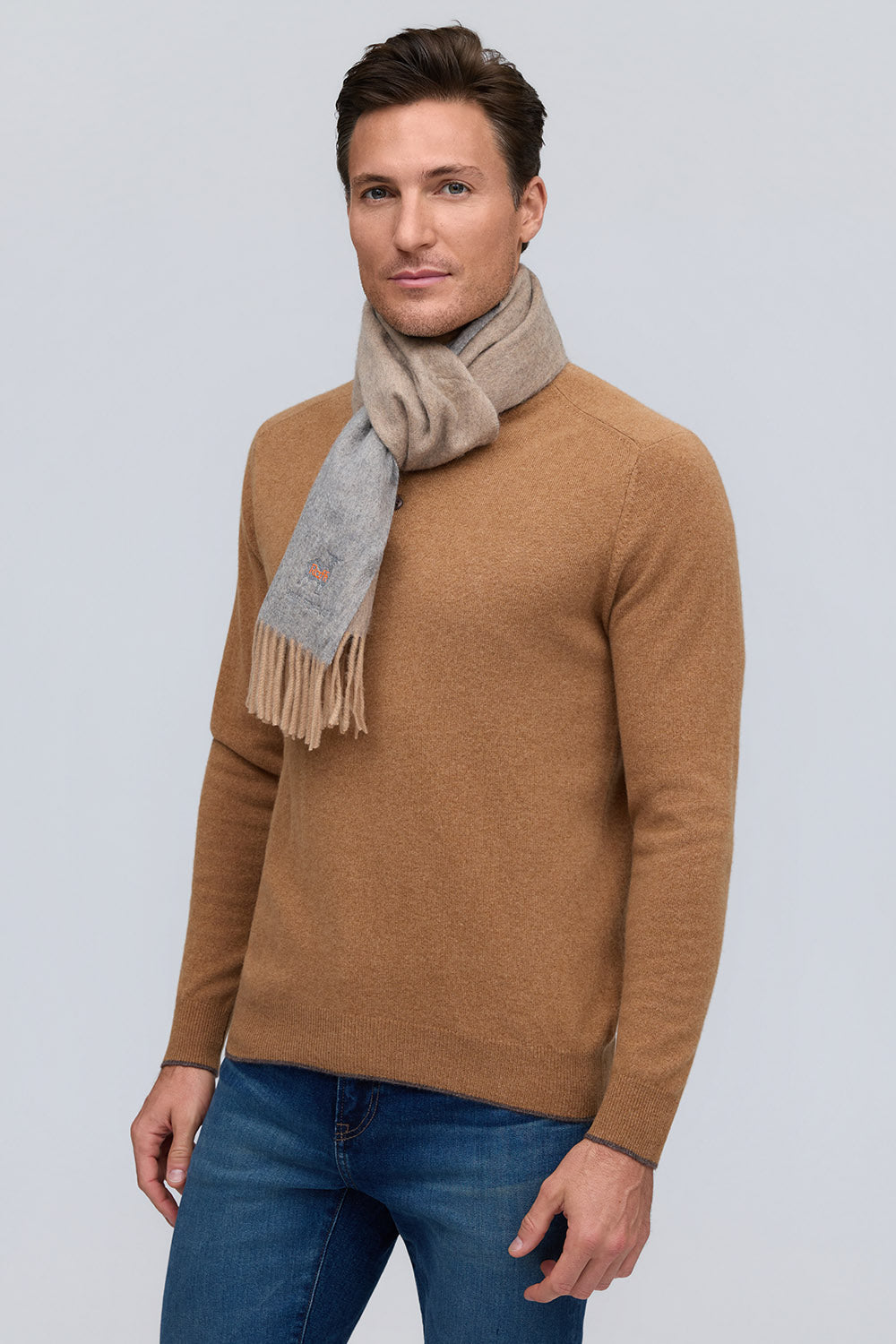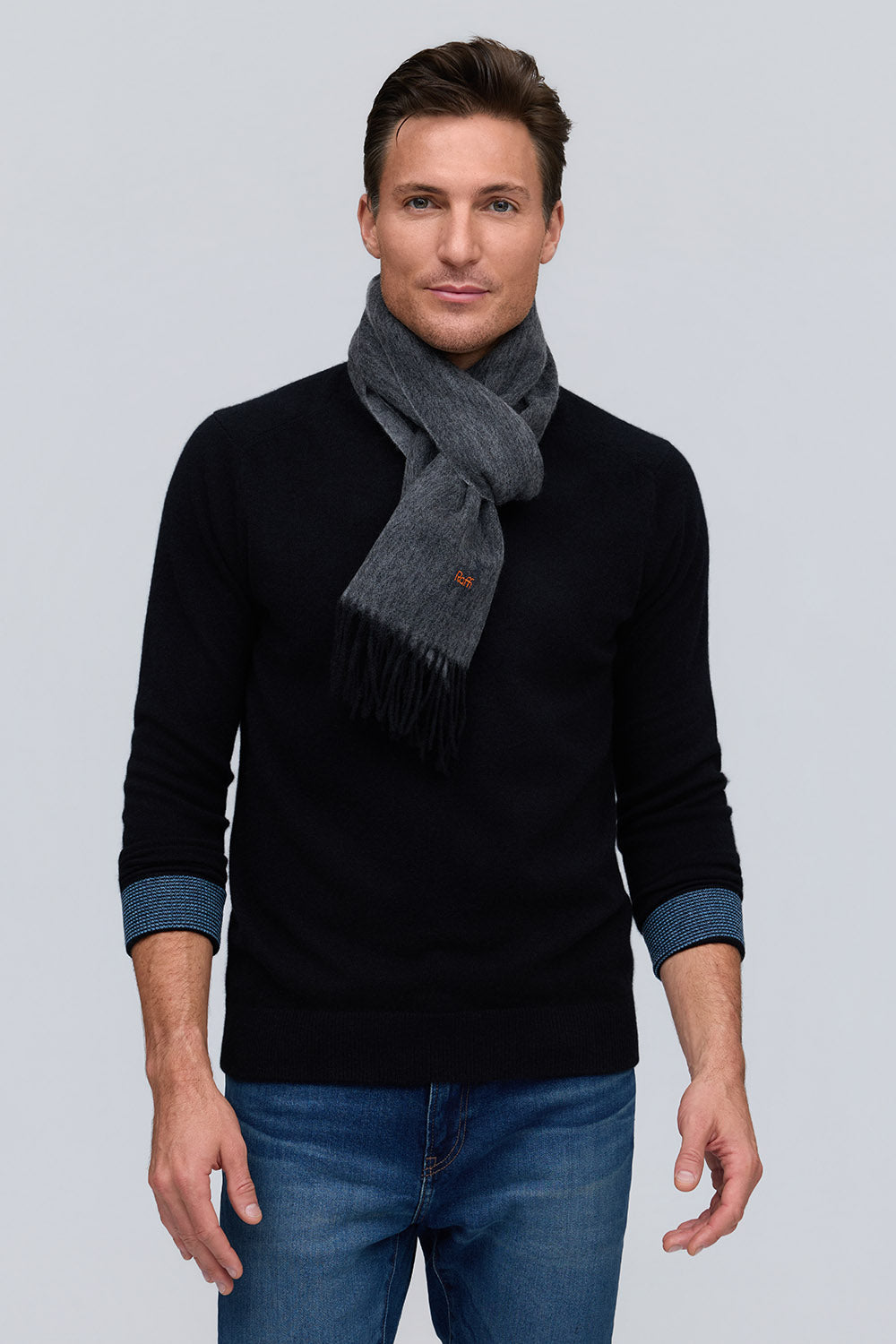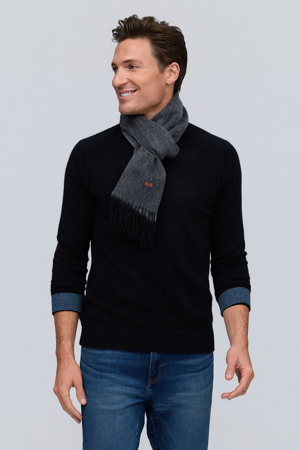 Woven from double-faced 100% cashmere, this scarf offers unparalleled softness and warmth in a refined two-tone design. Finished with classic fringe and an embroidered Raffi Forever logo for timeless style.