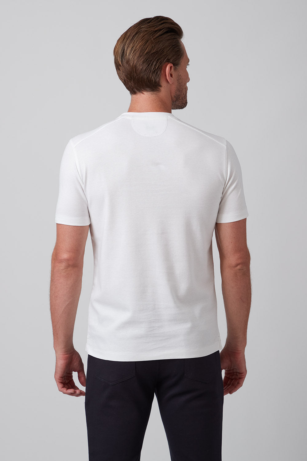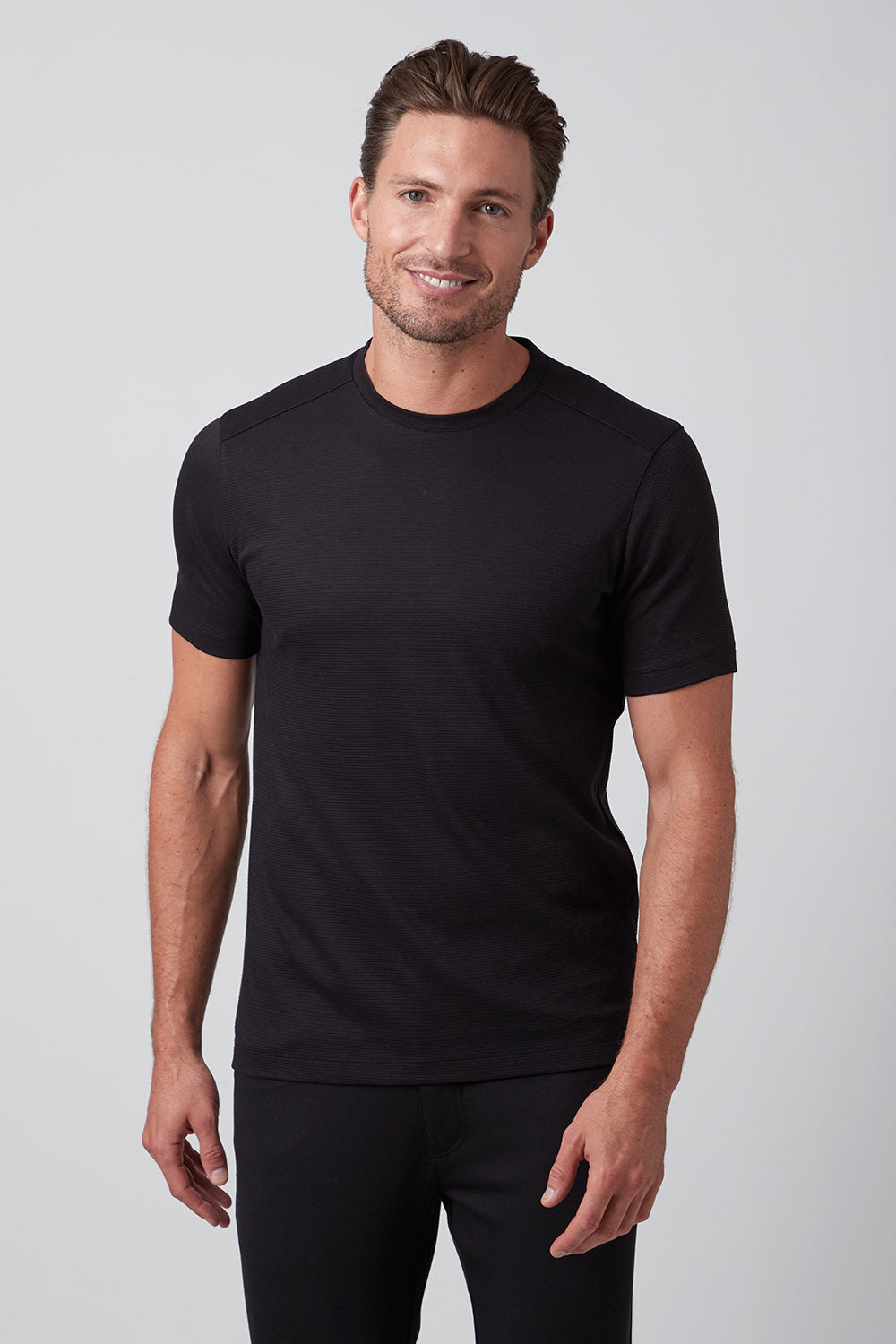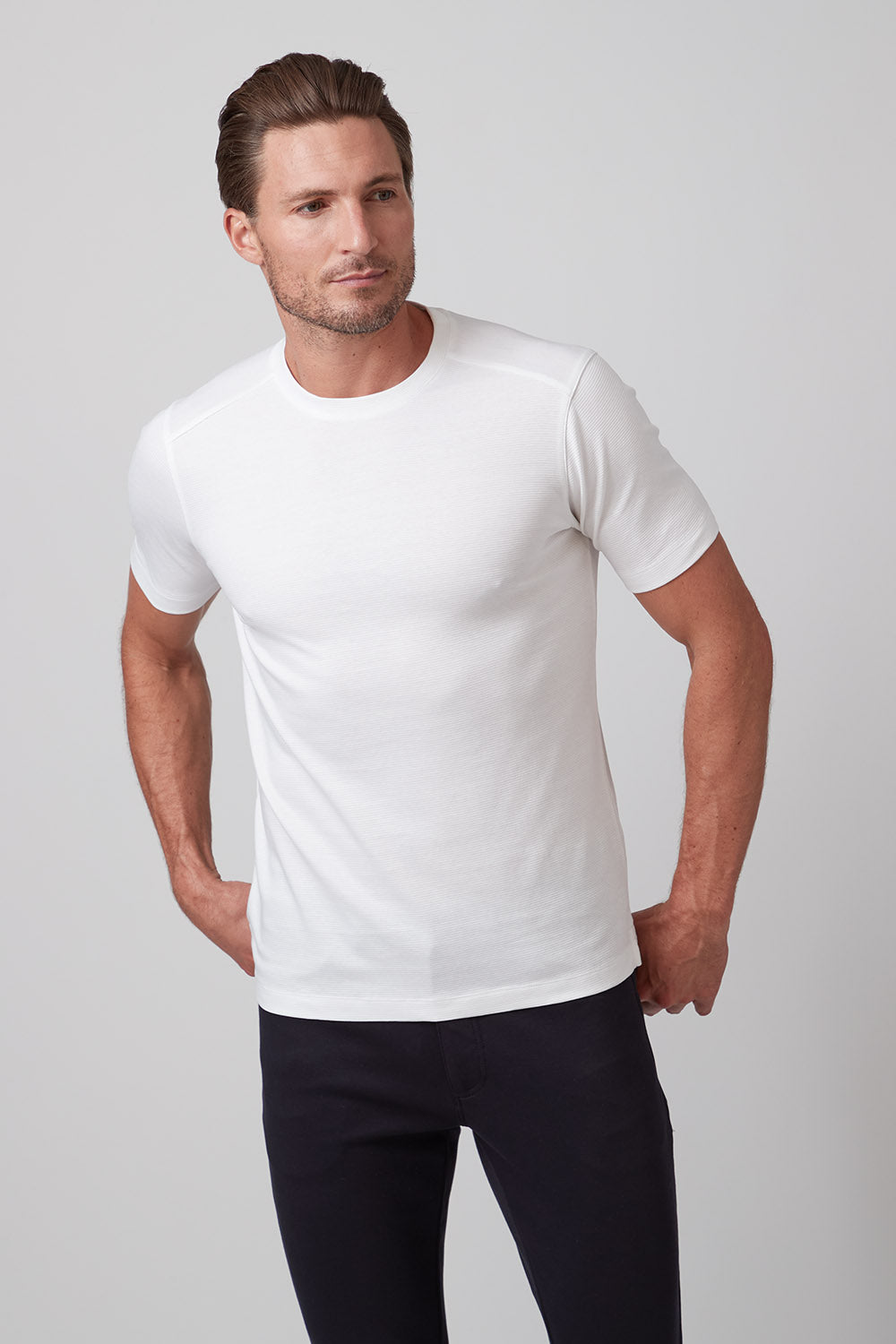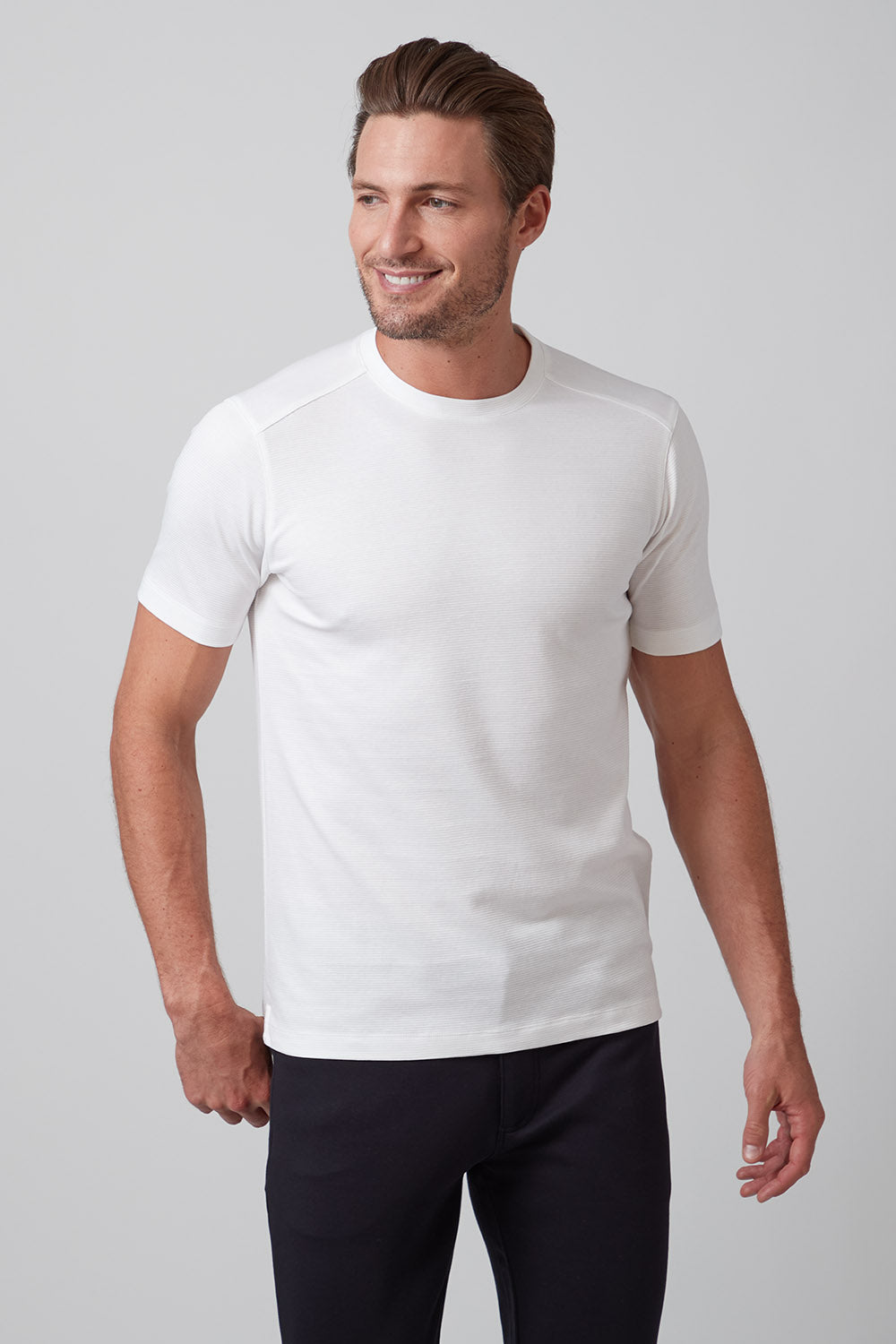 Get ready to strut your stuff in our brand new 100% Aqua Cotton crew neck t-shirt with tonal ribbed striping. Elevate your crew neck when hanging out with friends or dressing up for an event, The Silas is both comfortable and stylish and comes in classic colors white and black, taking your casual look to the next level!