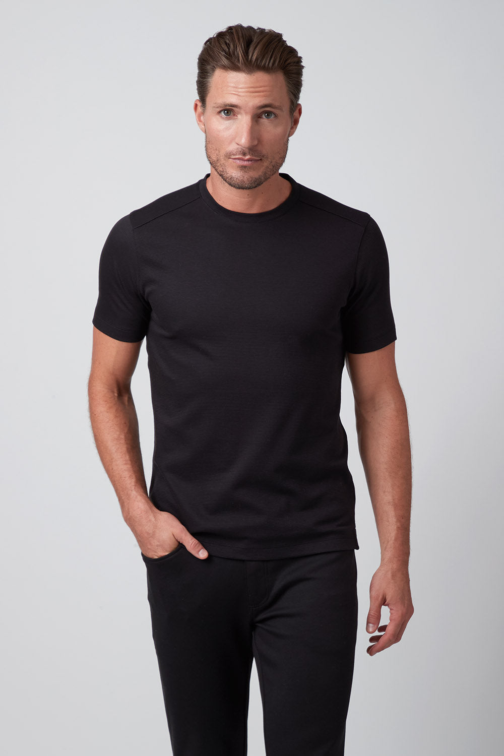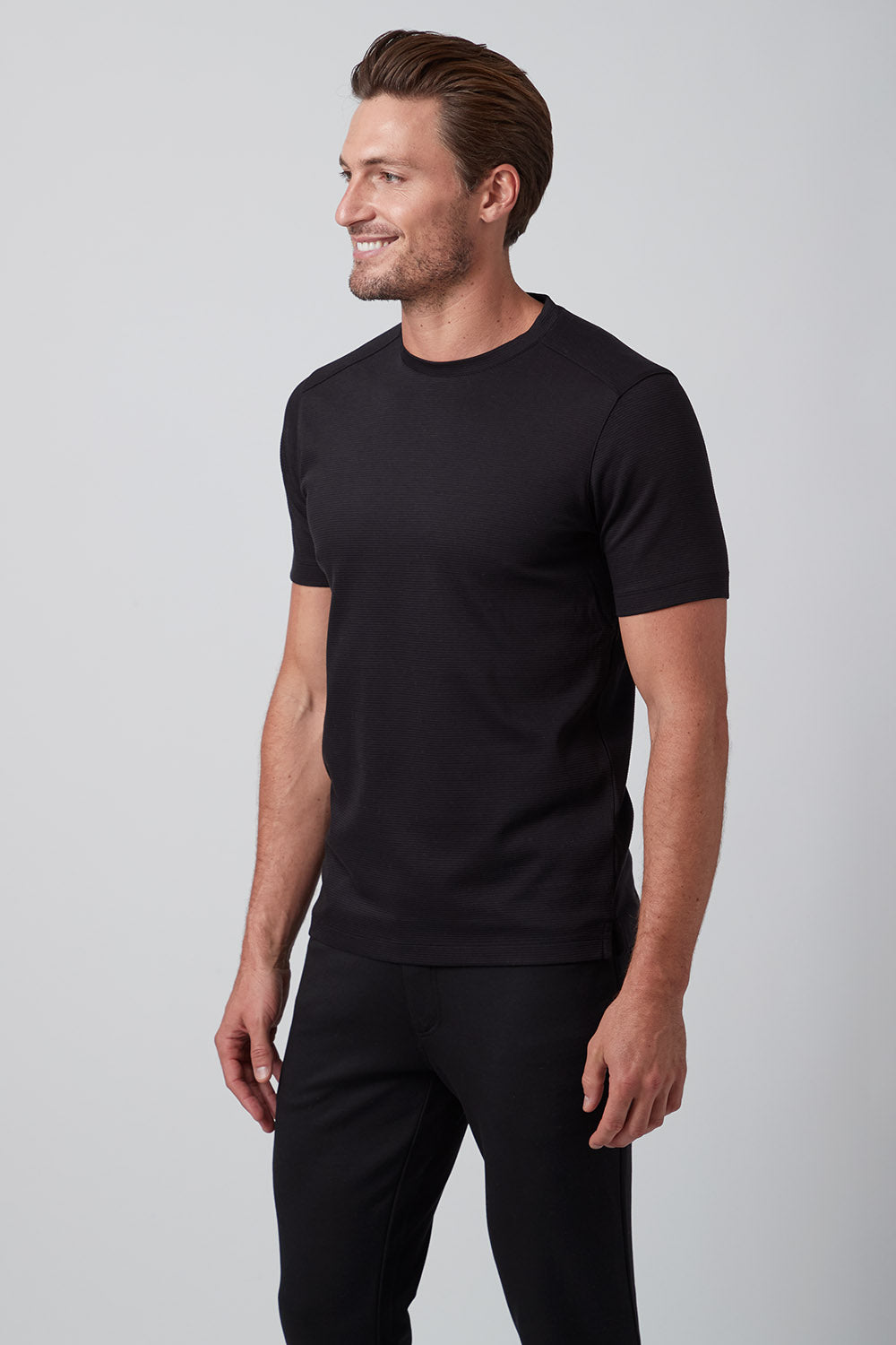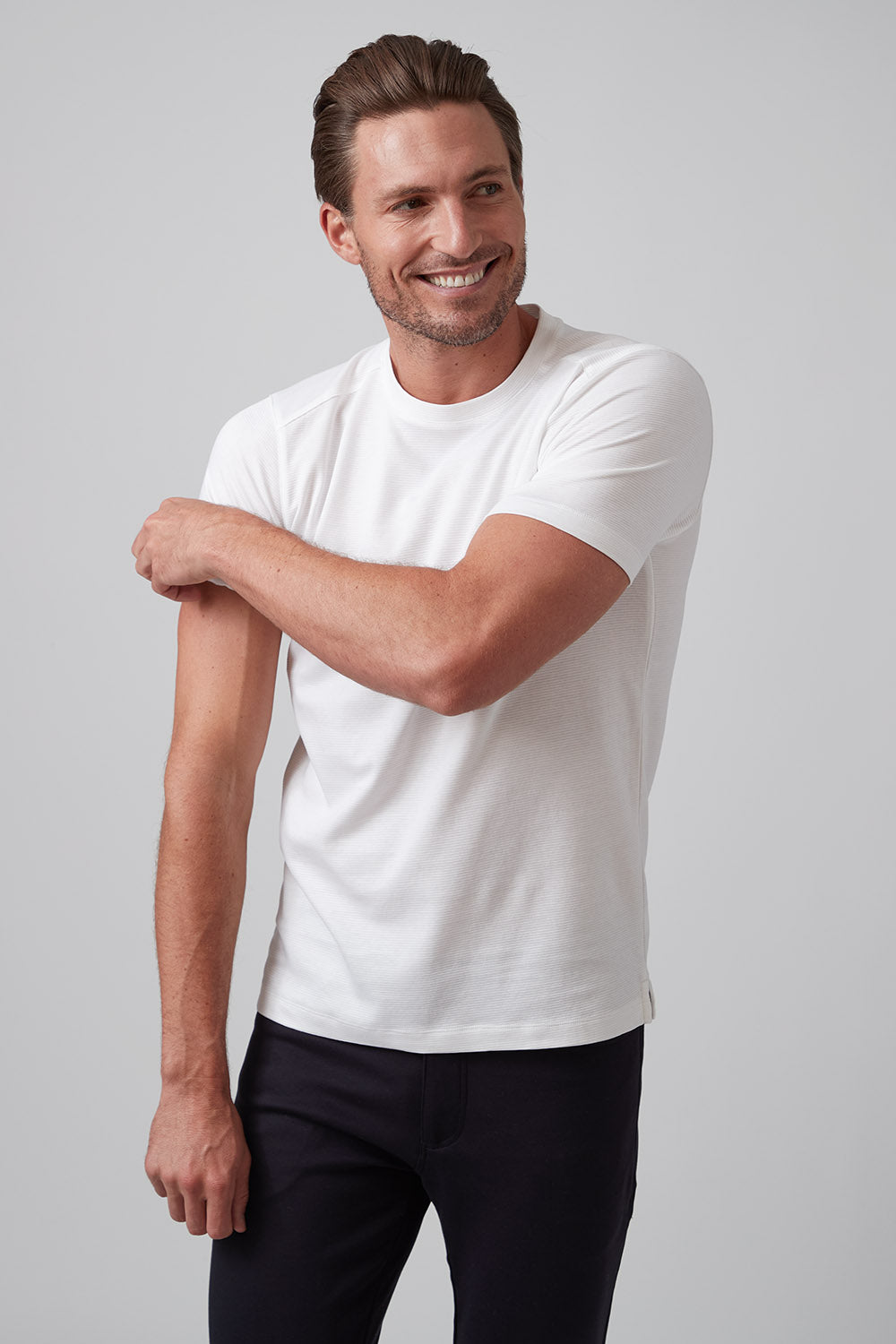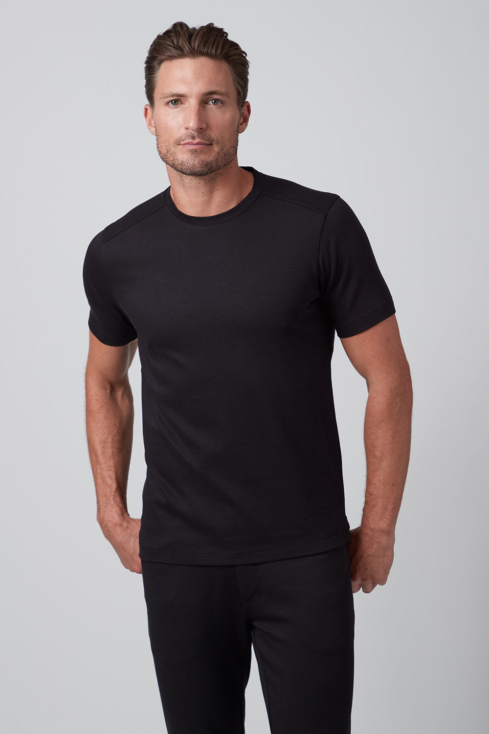 Get ready to strut your stuff in our brand new 100% Aqua Cotton crew neck t-shirt with tonal ribbed striping. Elevate your crew neck when hanging out with friends or dressing up for an event, The Silas is both comfortable and stylish and comes in classic colors white and black, taking your casual look to the next level!