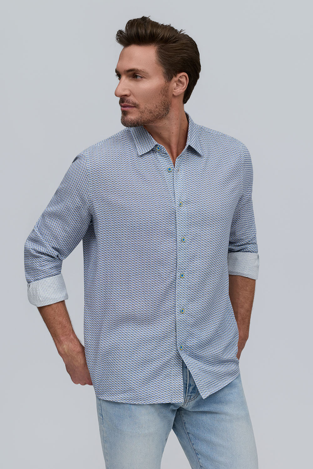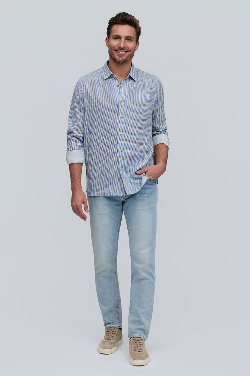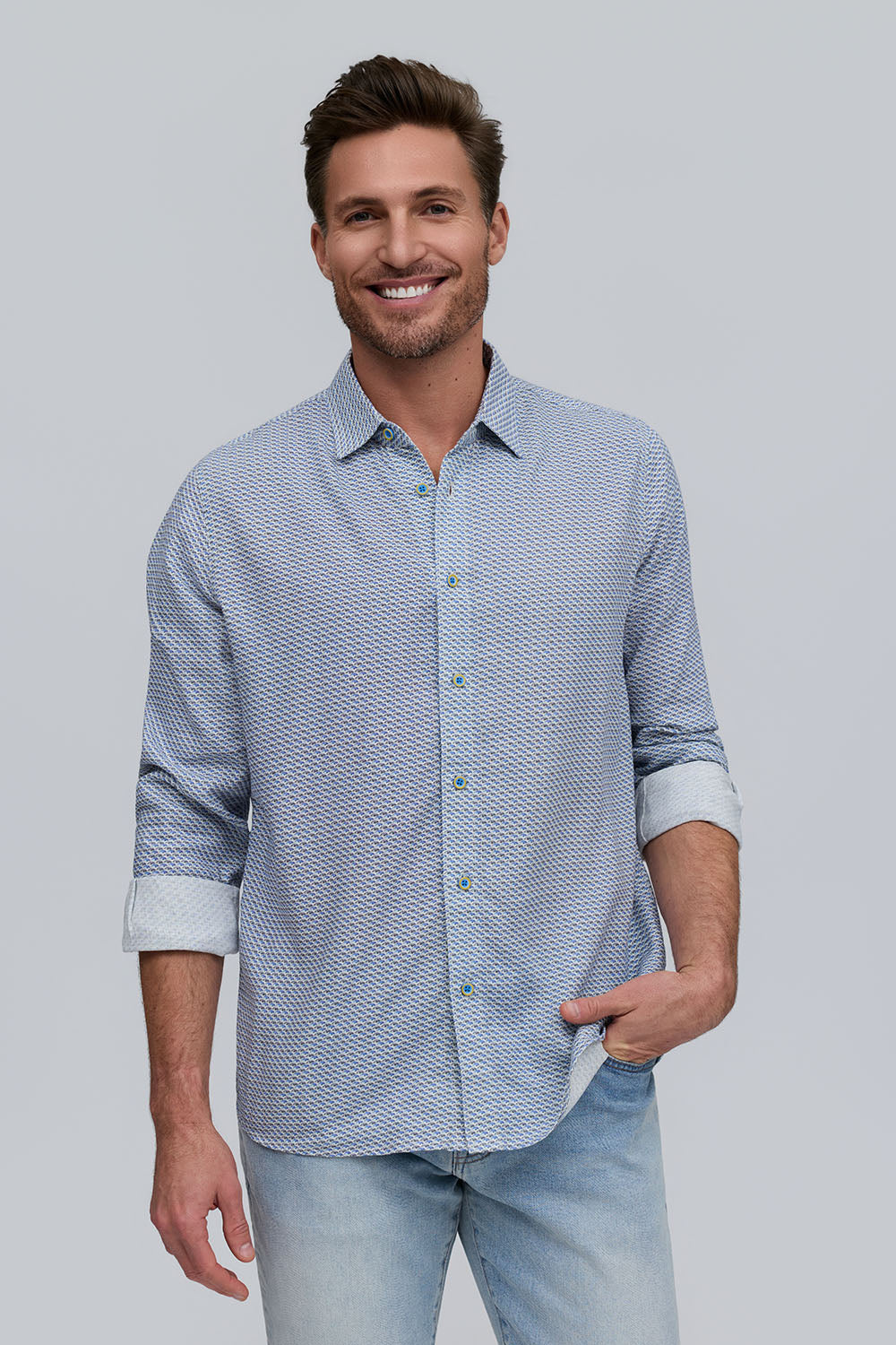 The Tatum is a long-sleeve linen-blend shirt with a subtle mini shell print in blue, offering a refined coastal touch. Its relaxed drape and breathable feel make it an effortless, day-to-night warm-weather essential.