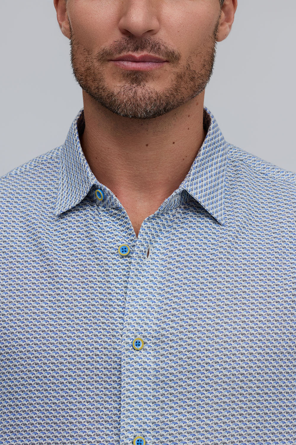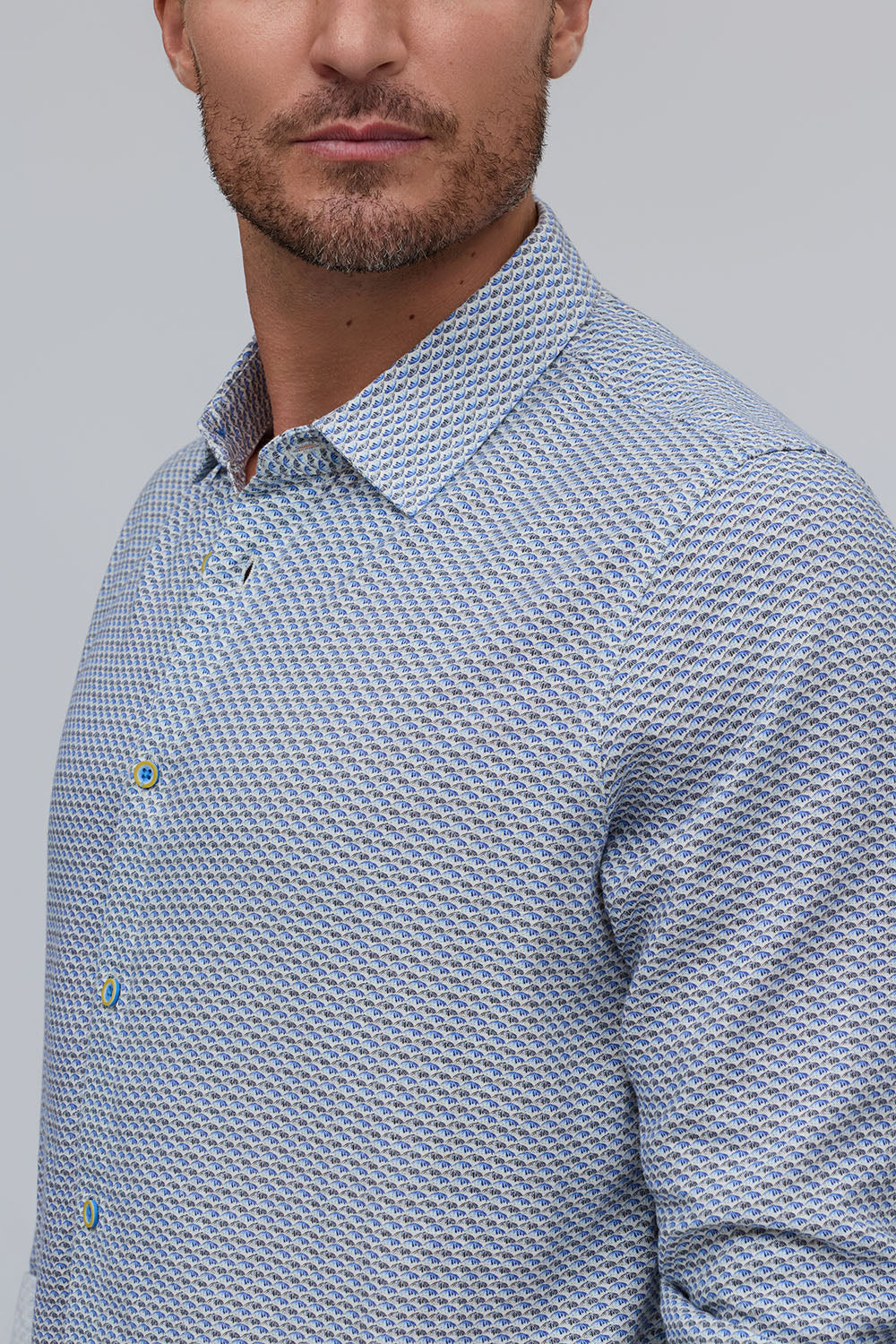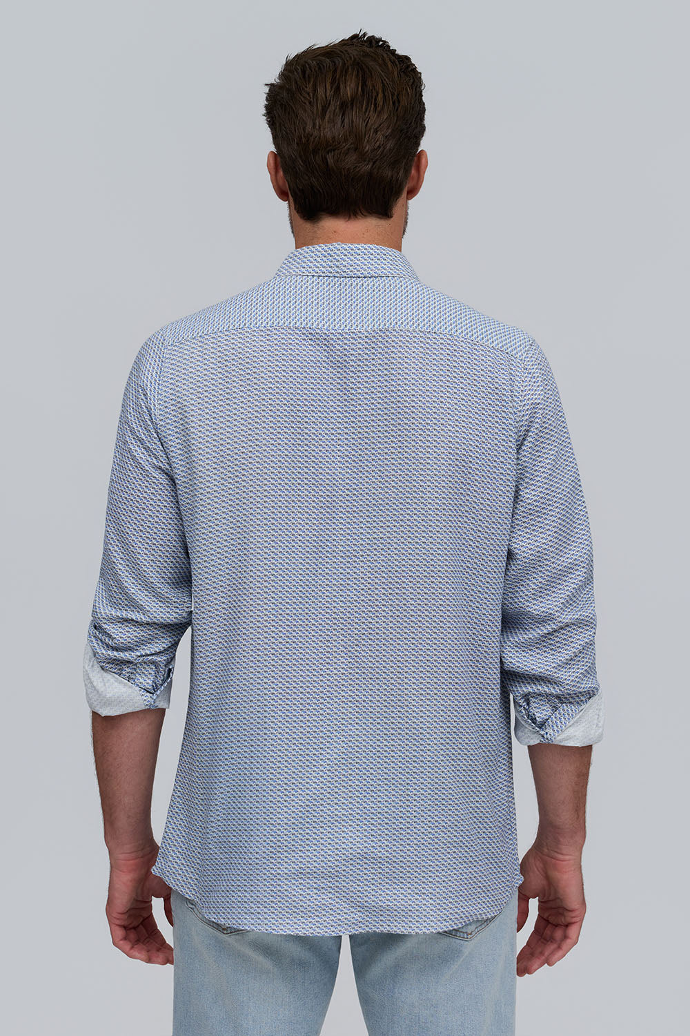 The Tatum is a long-sleeve linen-blend shirt with a subtle mini shell print in blue, offering a refined coastal touch. Its relaxed drape and breathable feel make it an effortless, day-to-night warm-weather essential.
