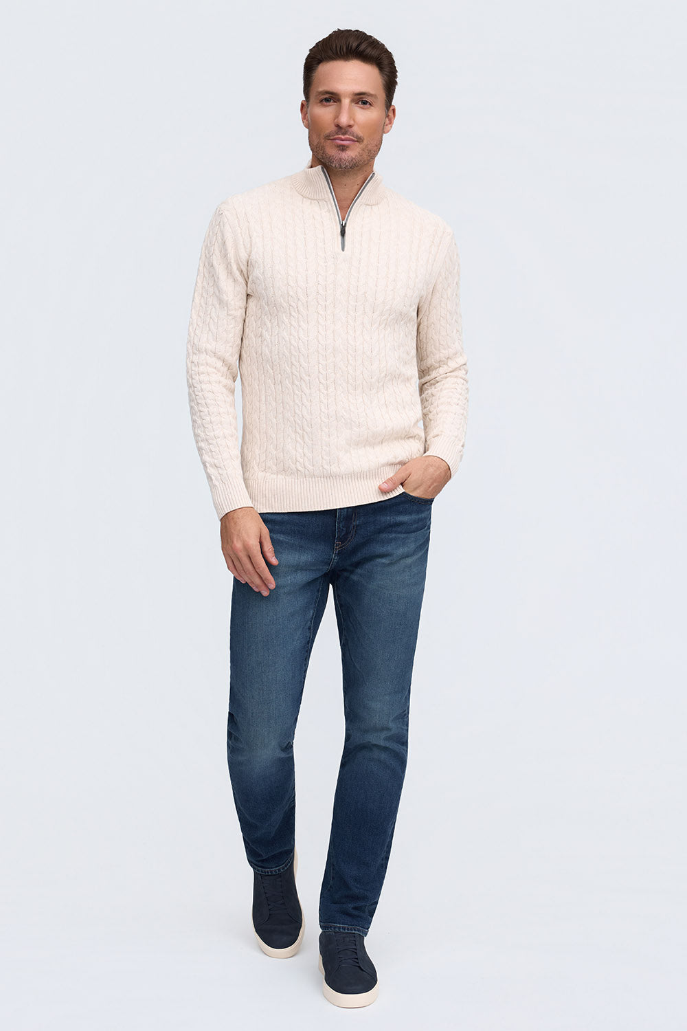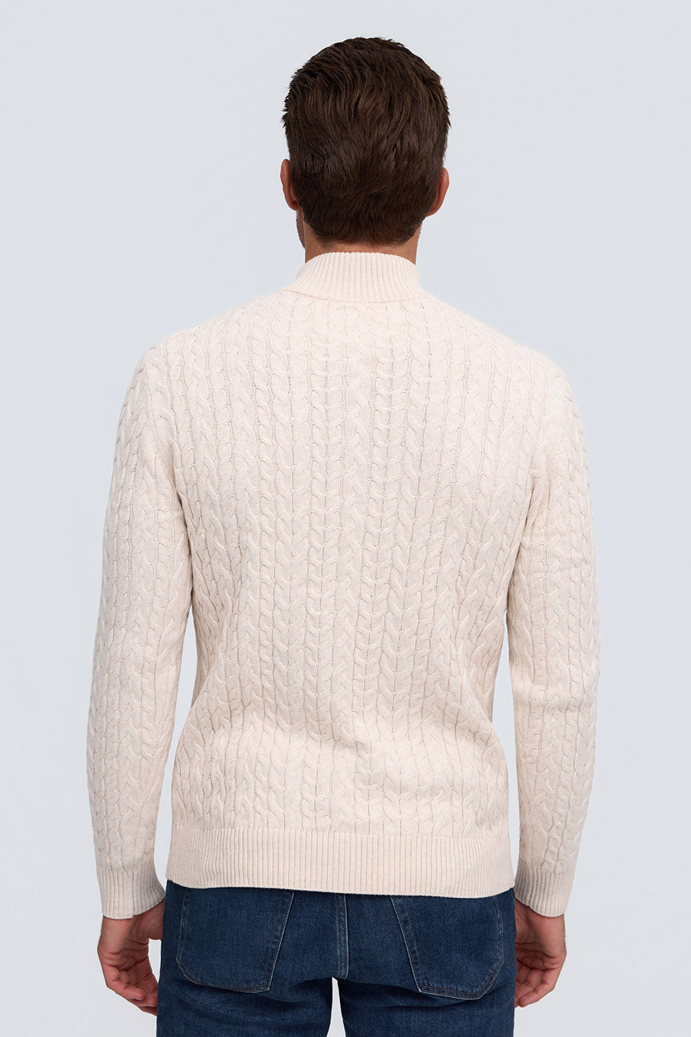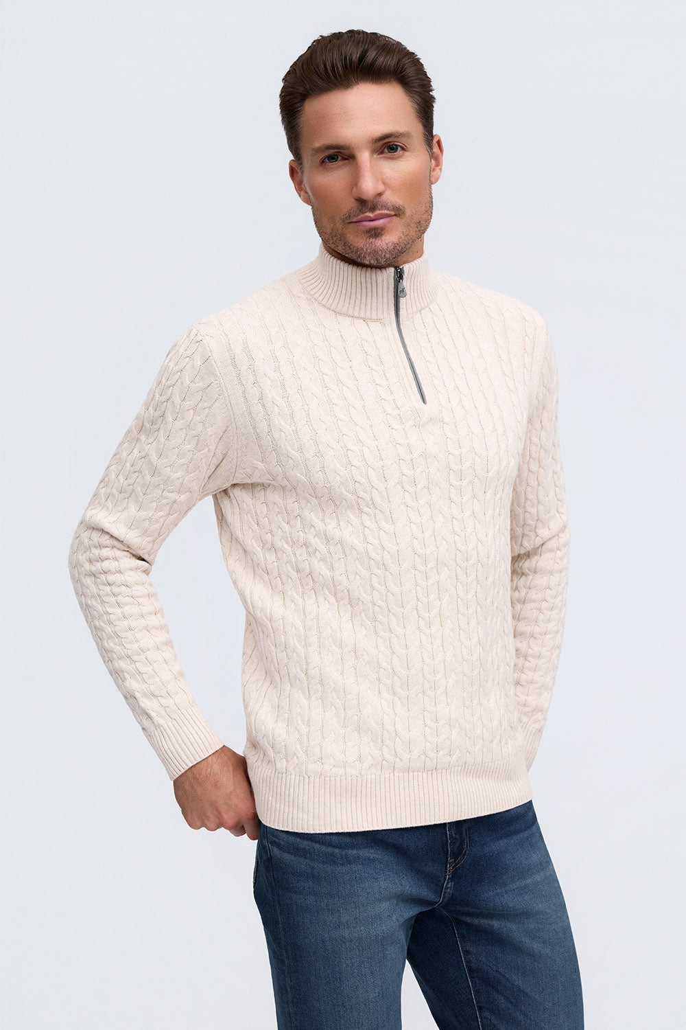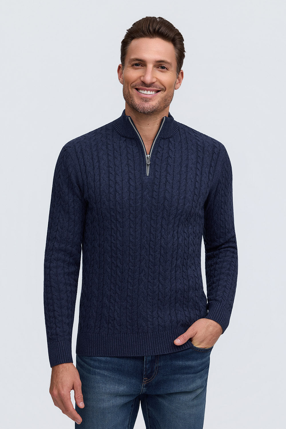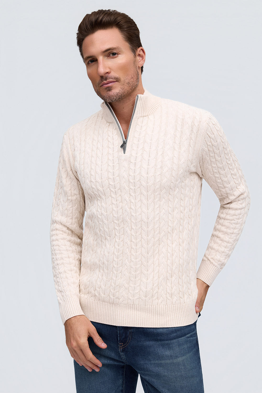 100% Cotton Cable Knit Zip Mock Neck Sweater