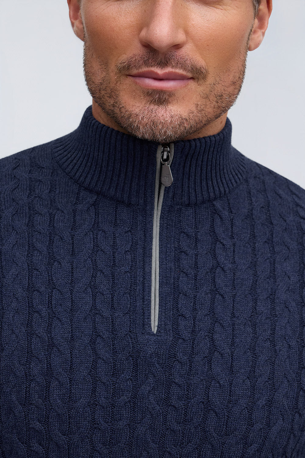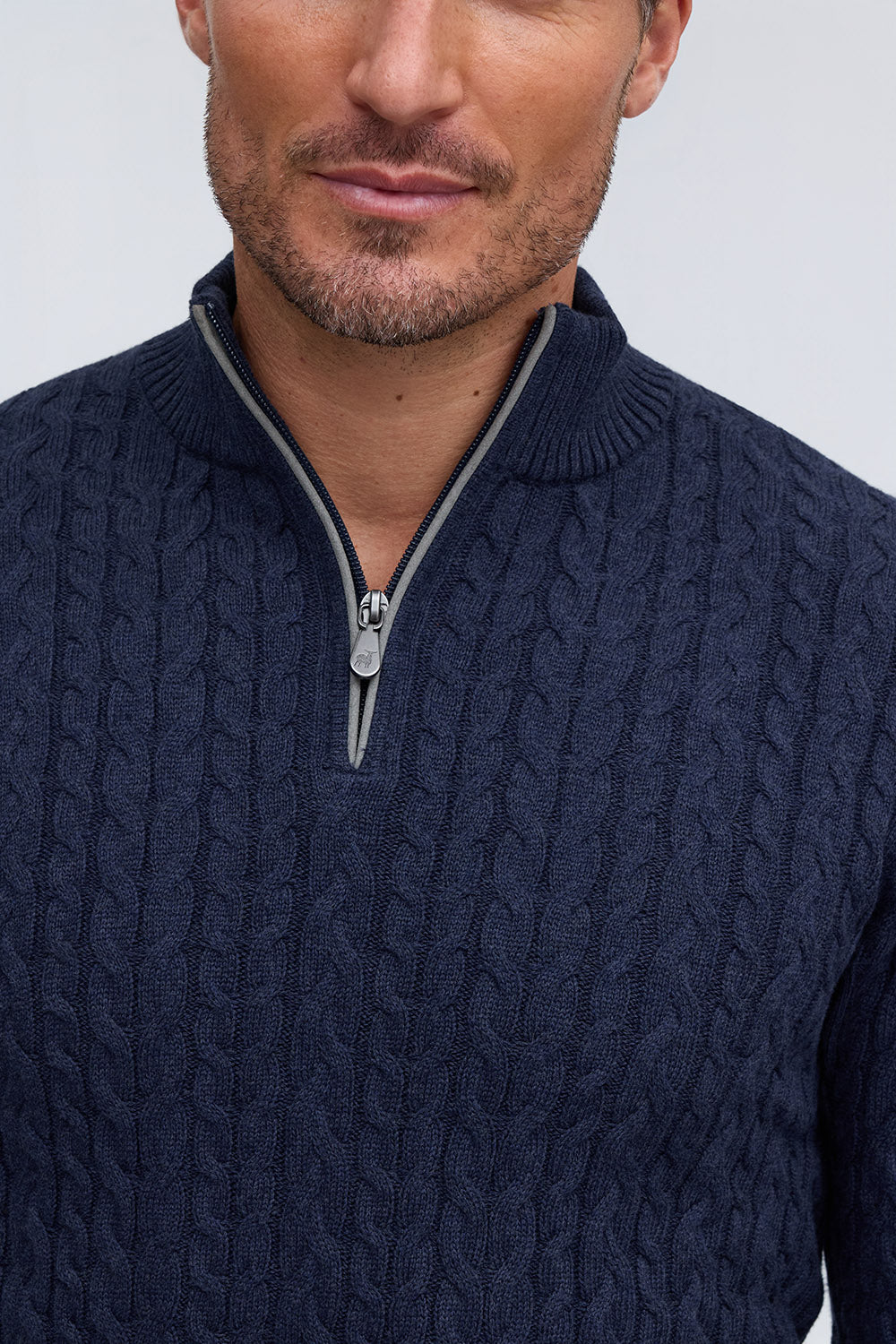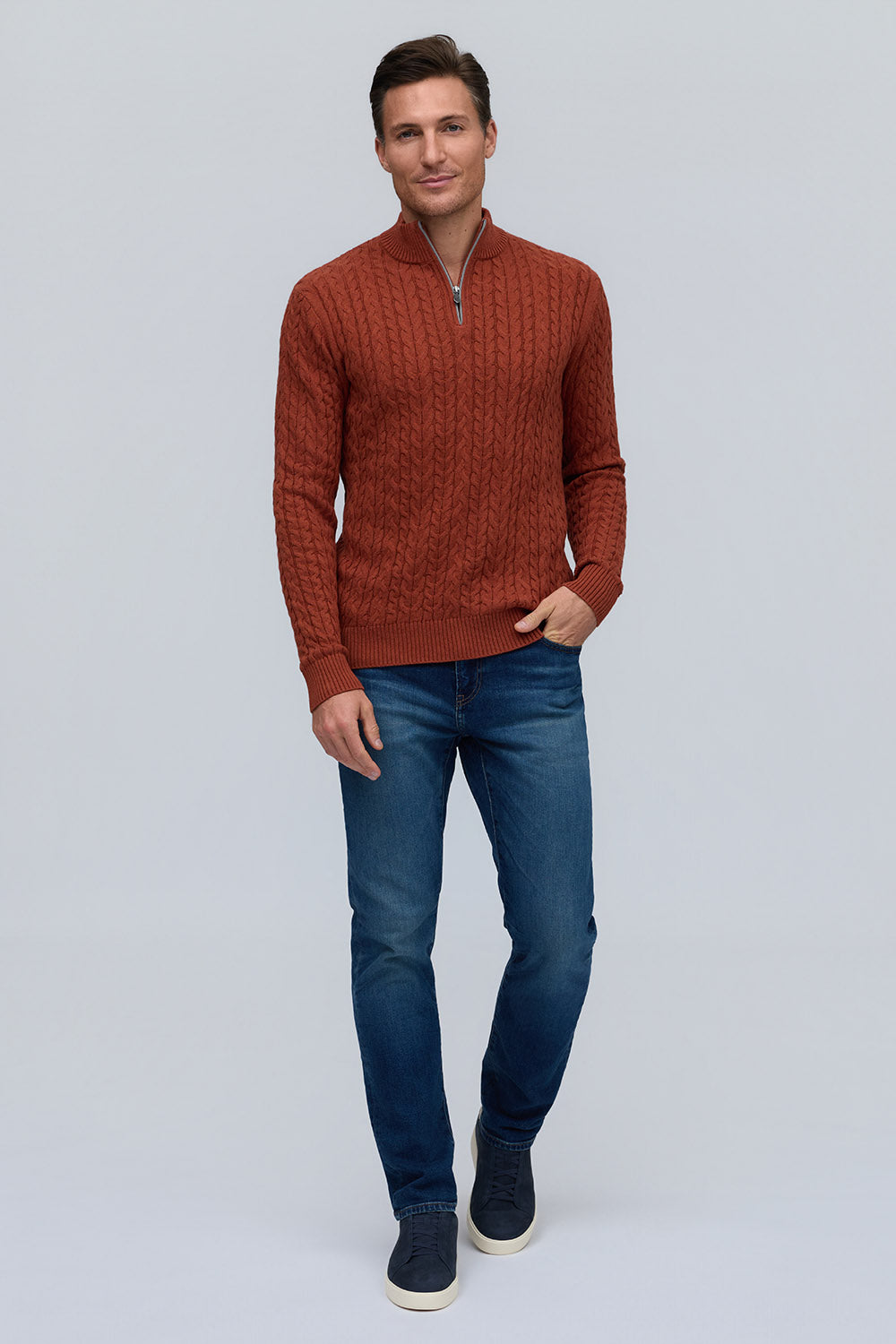 Crafted from soft cotton with classic cable knit texture, this sweater features refined suede trim at the zipper. Available in rich Fall tones, it offers warmth, comfort, and timeless sophistication.