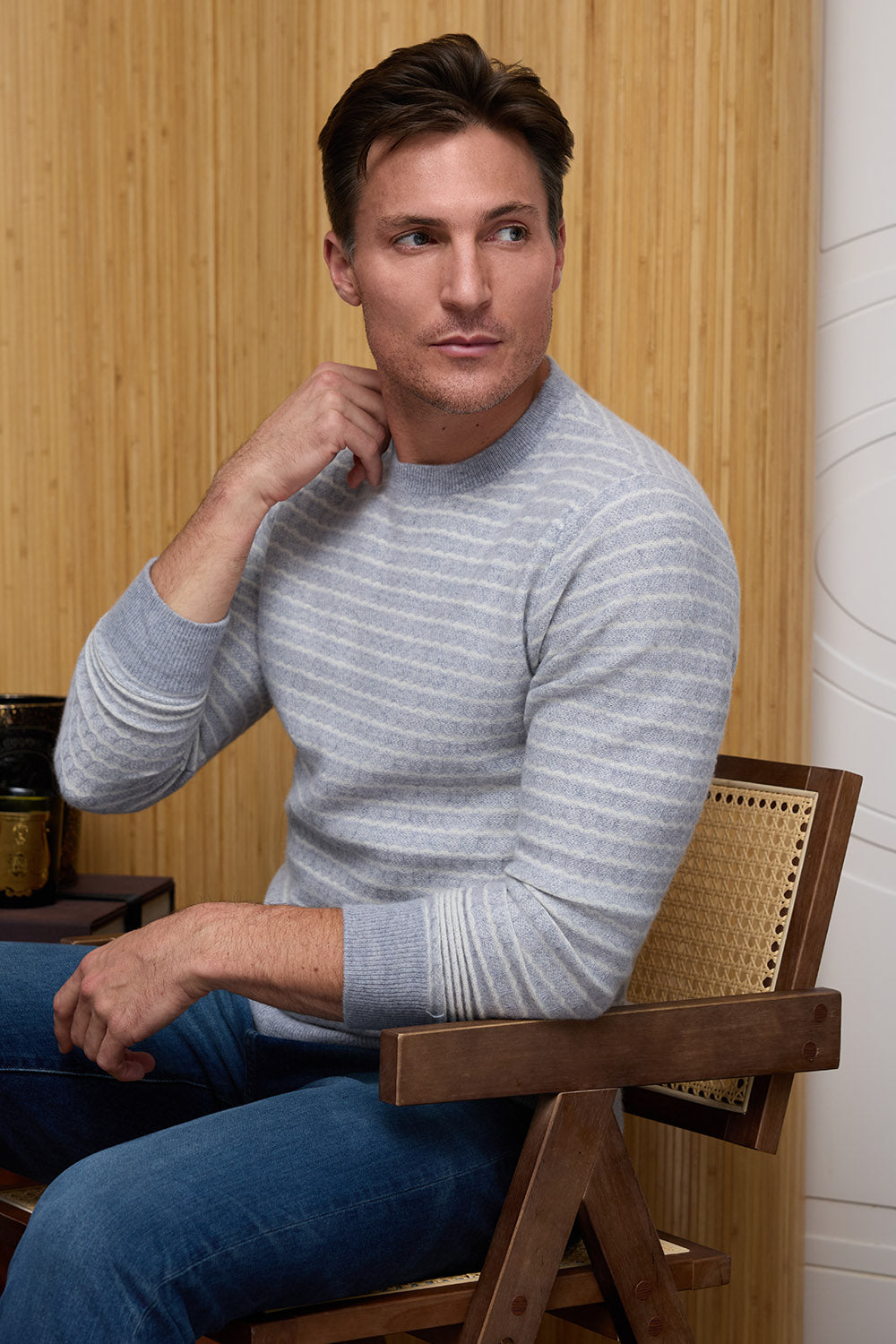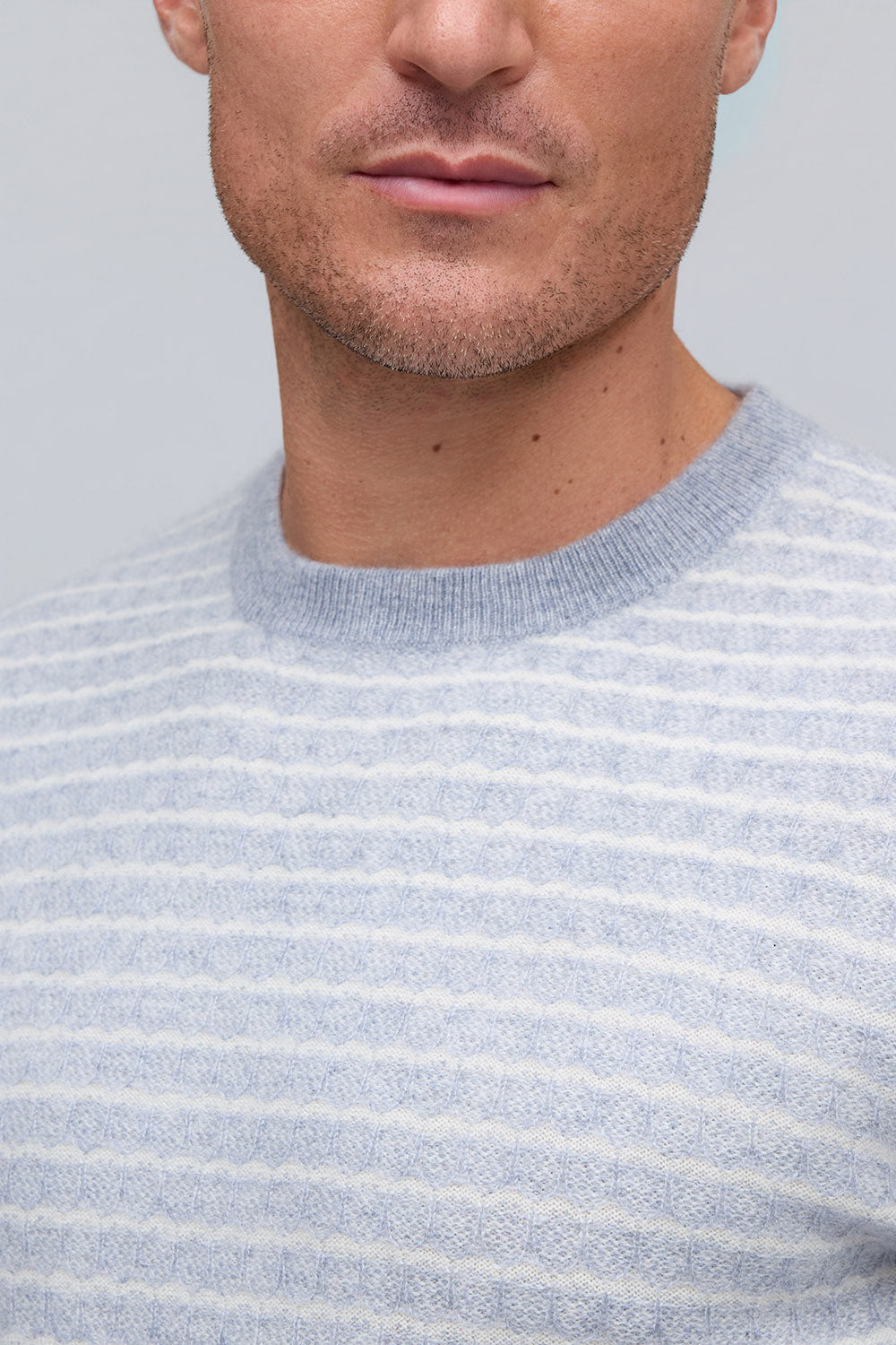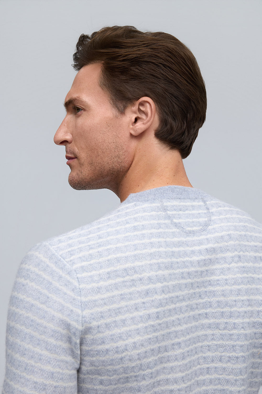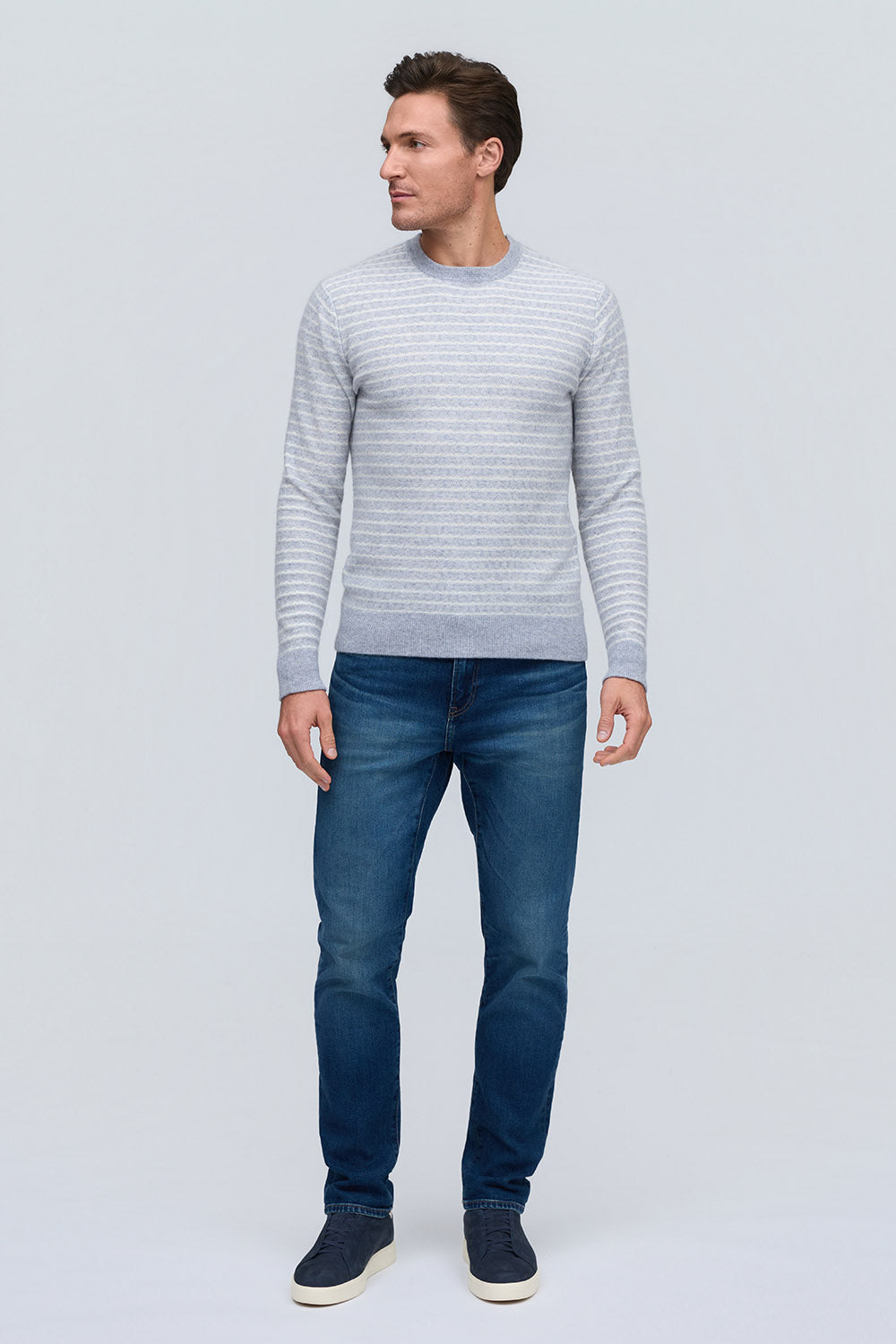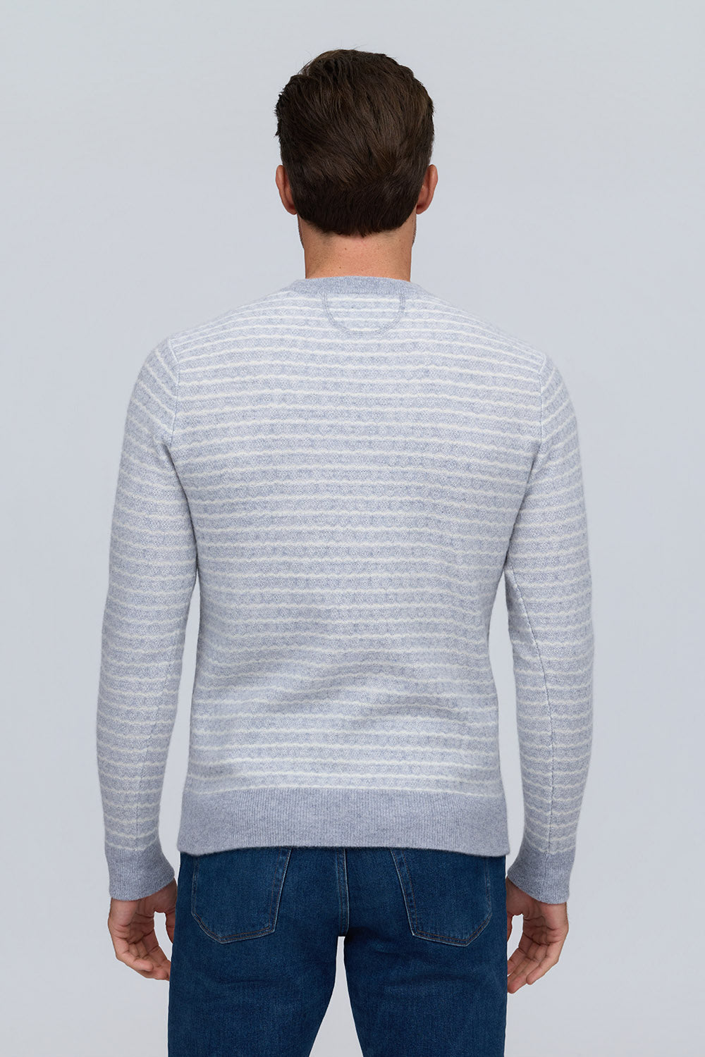 Crafted from 100% pure cashmere in versatile platinum, this crew neck sweater combines luxurious softness with intricate striped jacquard for refined texture and effortless sophistication.