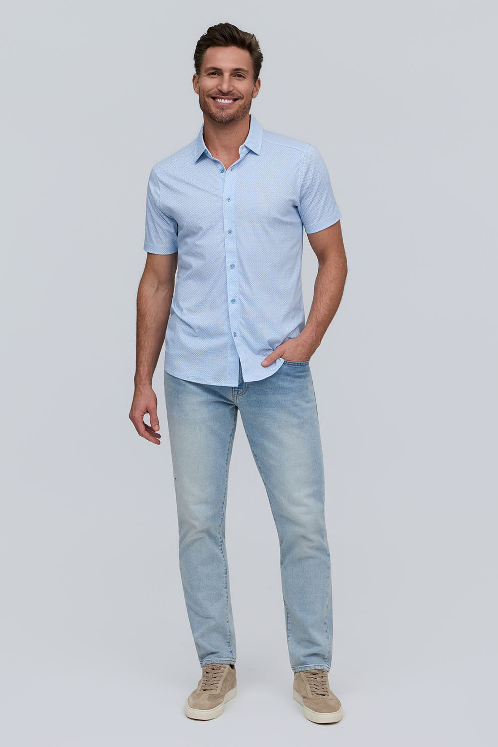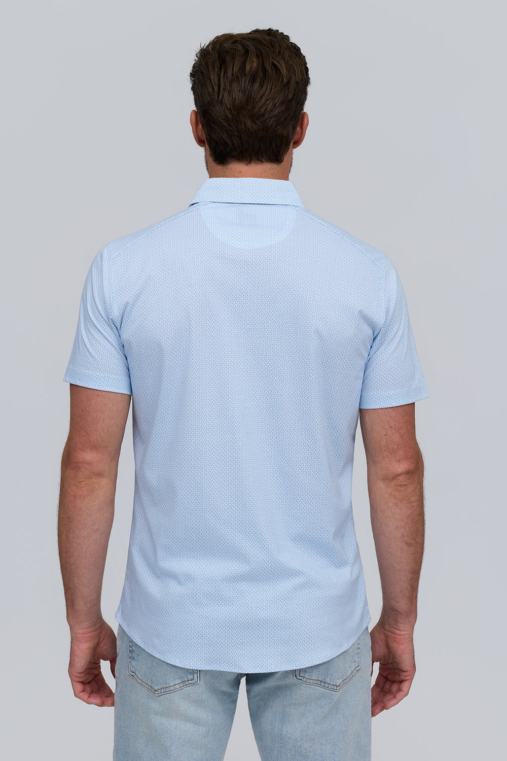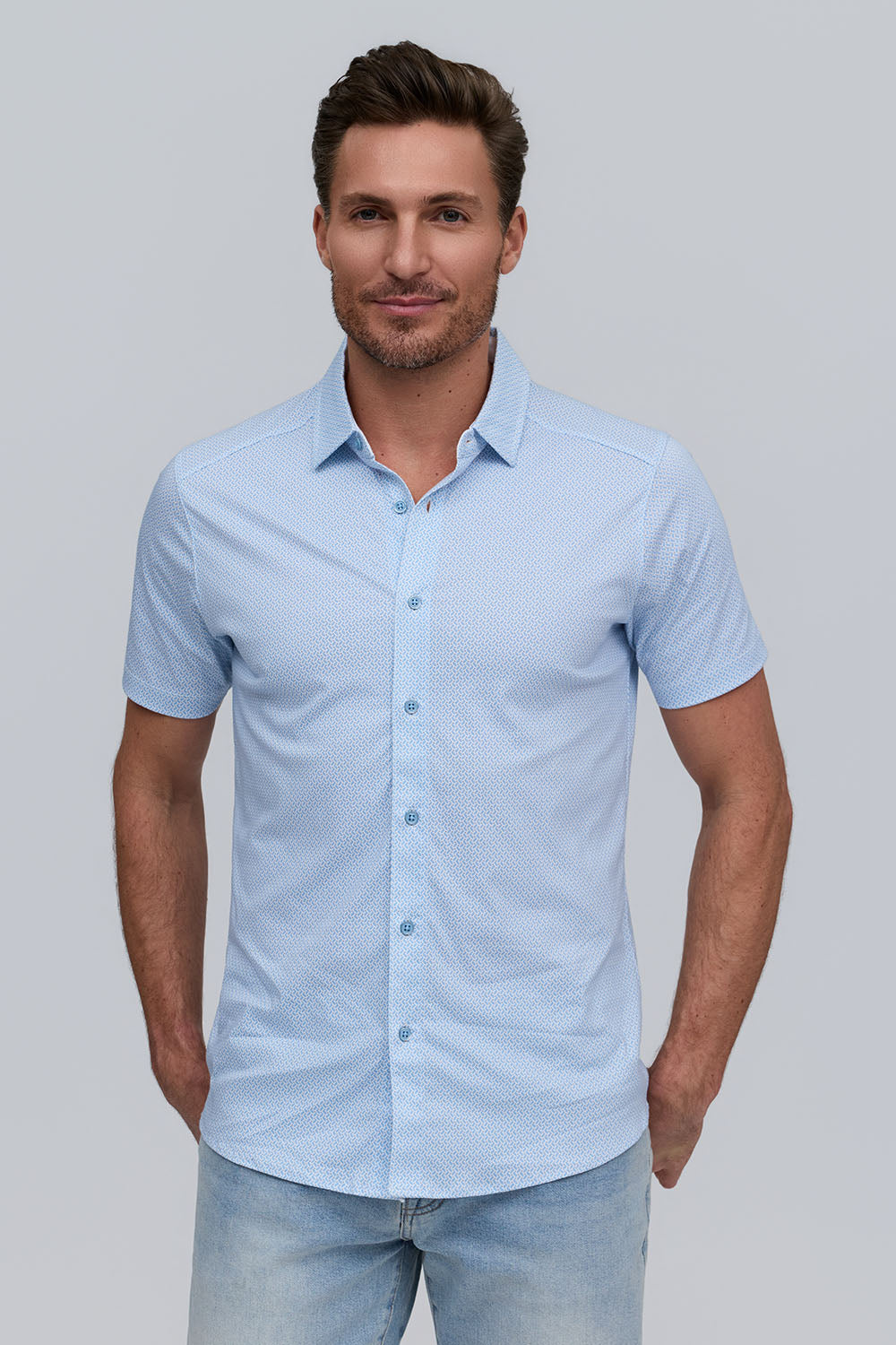 The Zeke is a mini-wave printed button-front shirt in soft, breathable Aqua Cotton. Its subtle pattern and clean silhouette create a refined, modern essential.